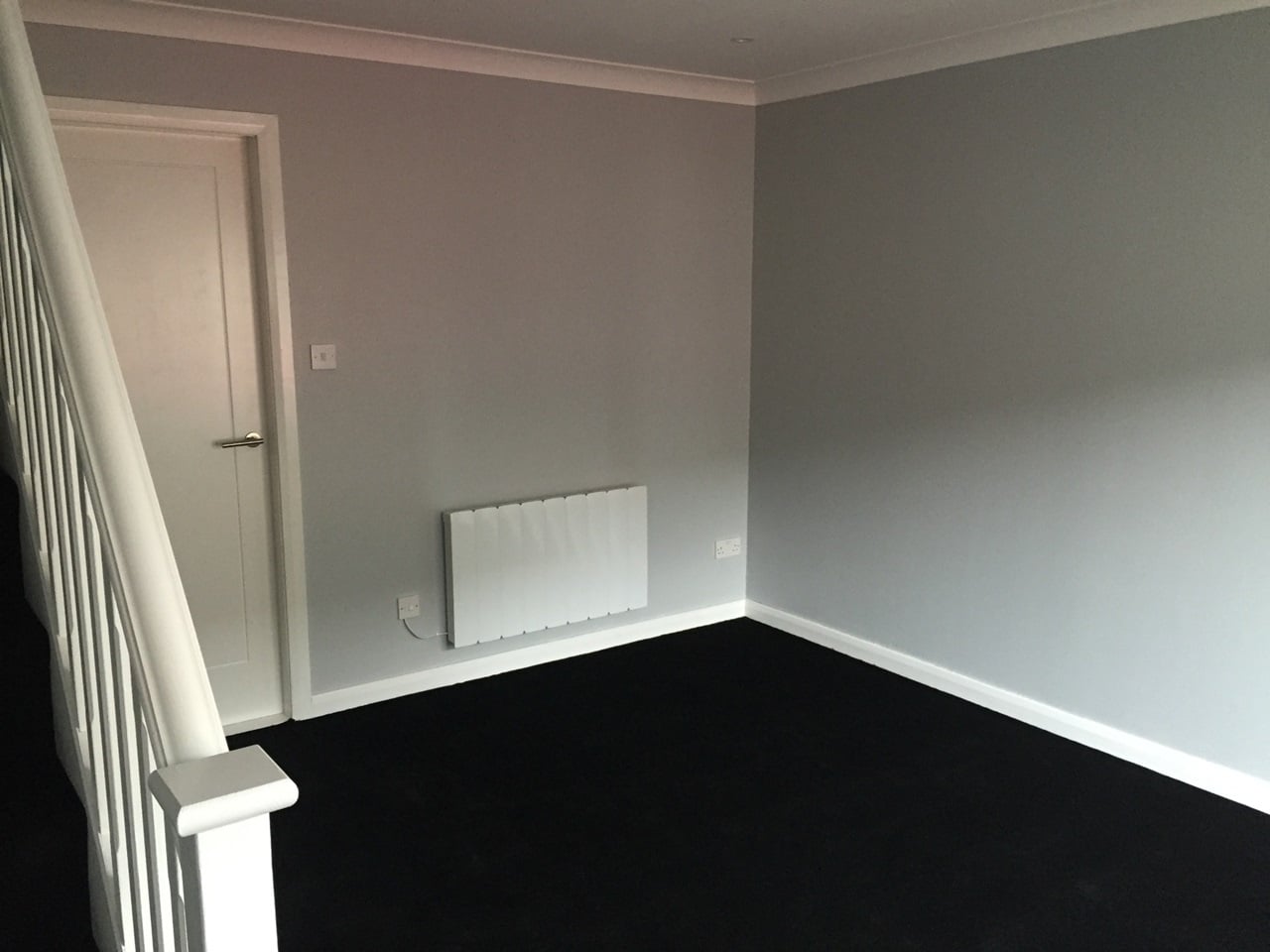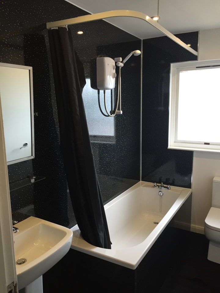BATHROOM WITH 3 PIECE WHITE SUITE WITH ELECTRIC SHOWER OVER BATH, HEATED TOWEL RAIL AND REMOTE CONTROL WALL HEATER.