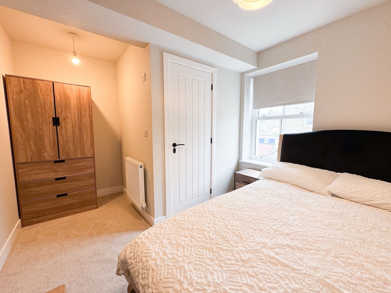 Fully furnished with bed, wardrobe, and storage