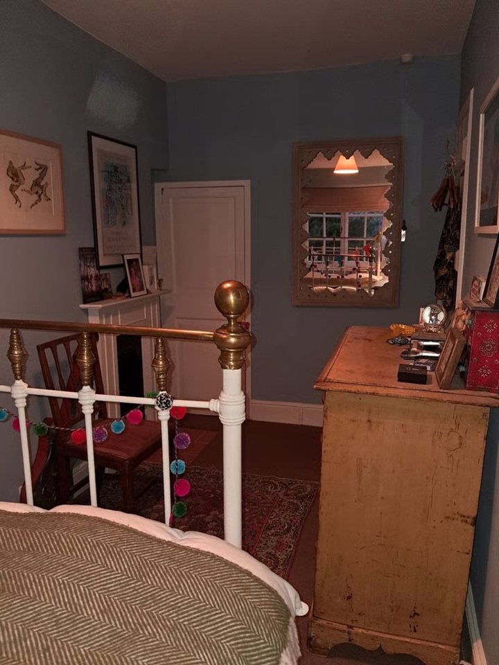 Chest of drawers and small hanging rail. Storage below cast iron bed.