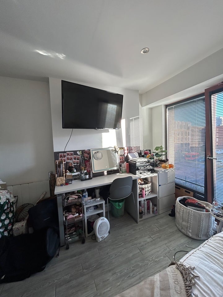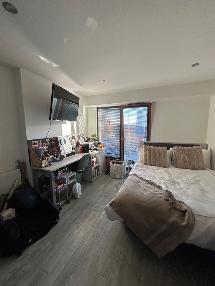 Spacious Living Area: The open-plan living space features a comfortable bed with plenty of natural light flooding in through large windows. The sleek, wood-effect flooring gives the room a warm and inviting feel, while the efficient layout maximizes space.