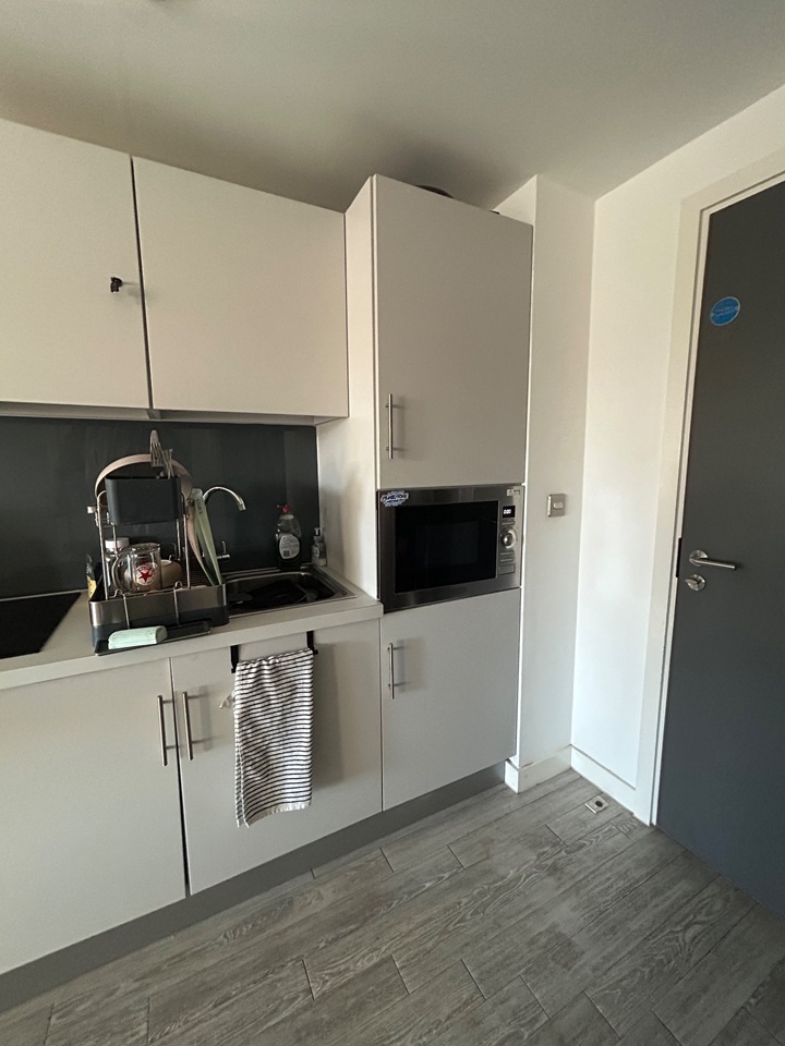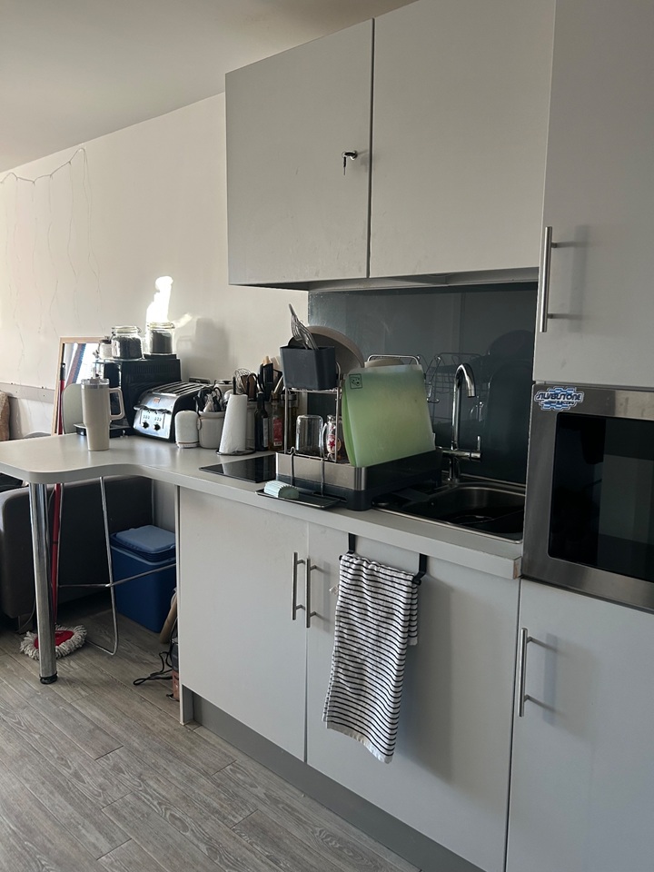 Fully Equipped Kitchen: The kitchen area is compact yet functional, with modern appliances including a hob, oven, fridge. There’s plenty of storage space in the cabinets, and a dining table area for enjoying meals or working.