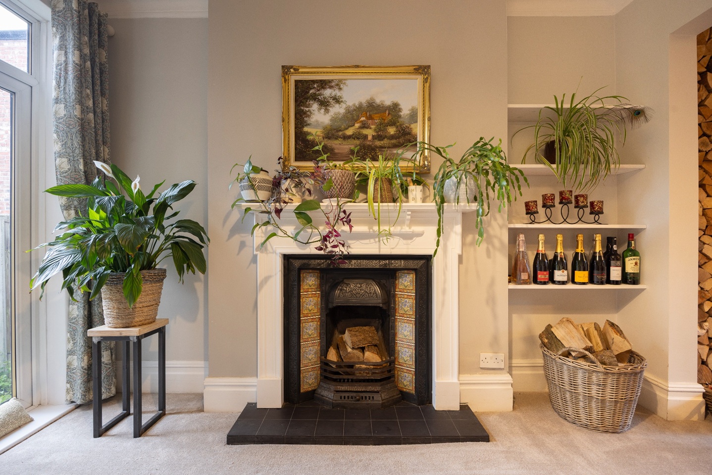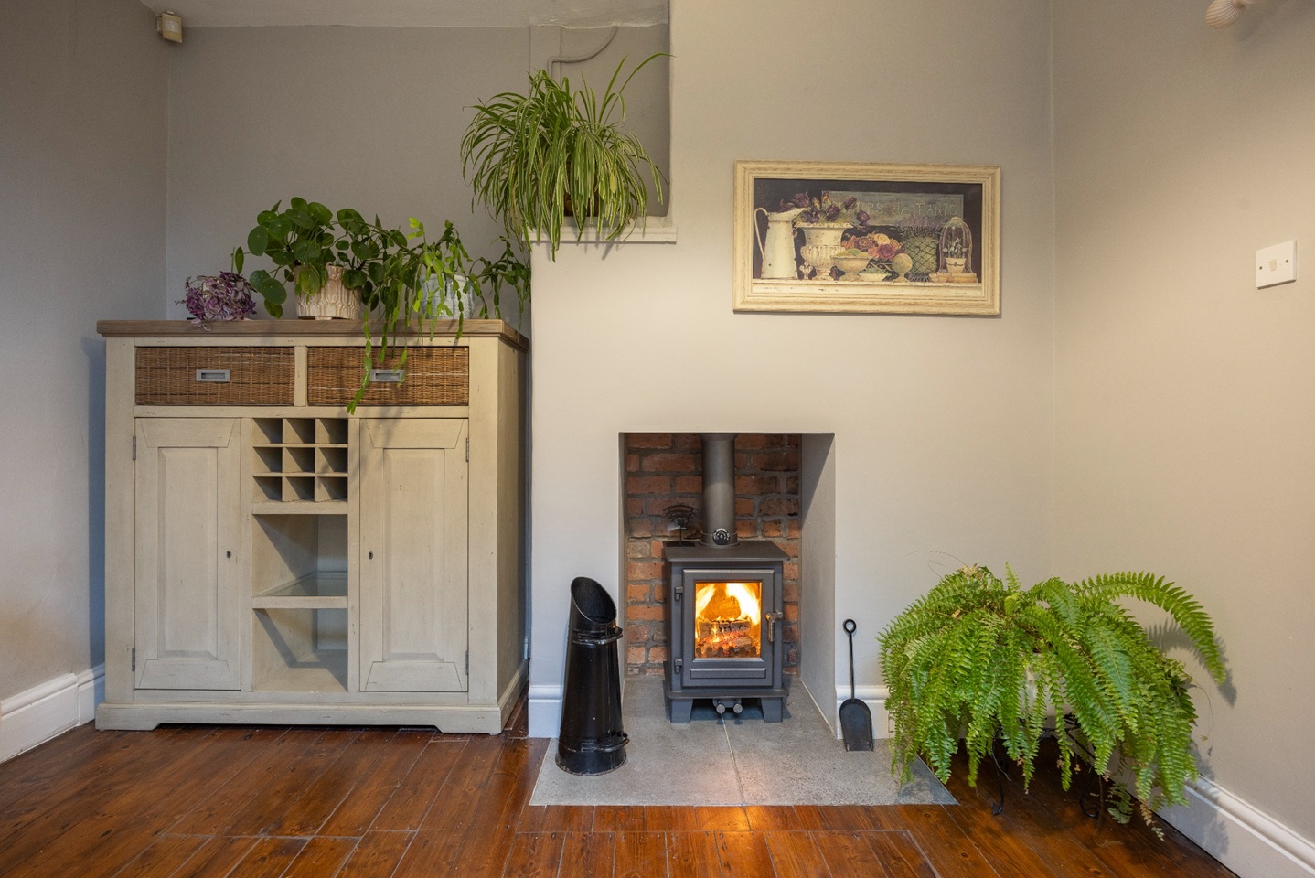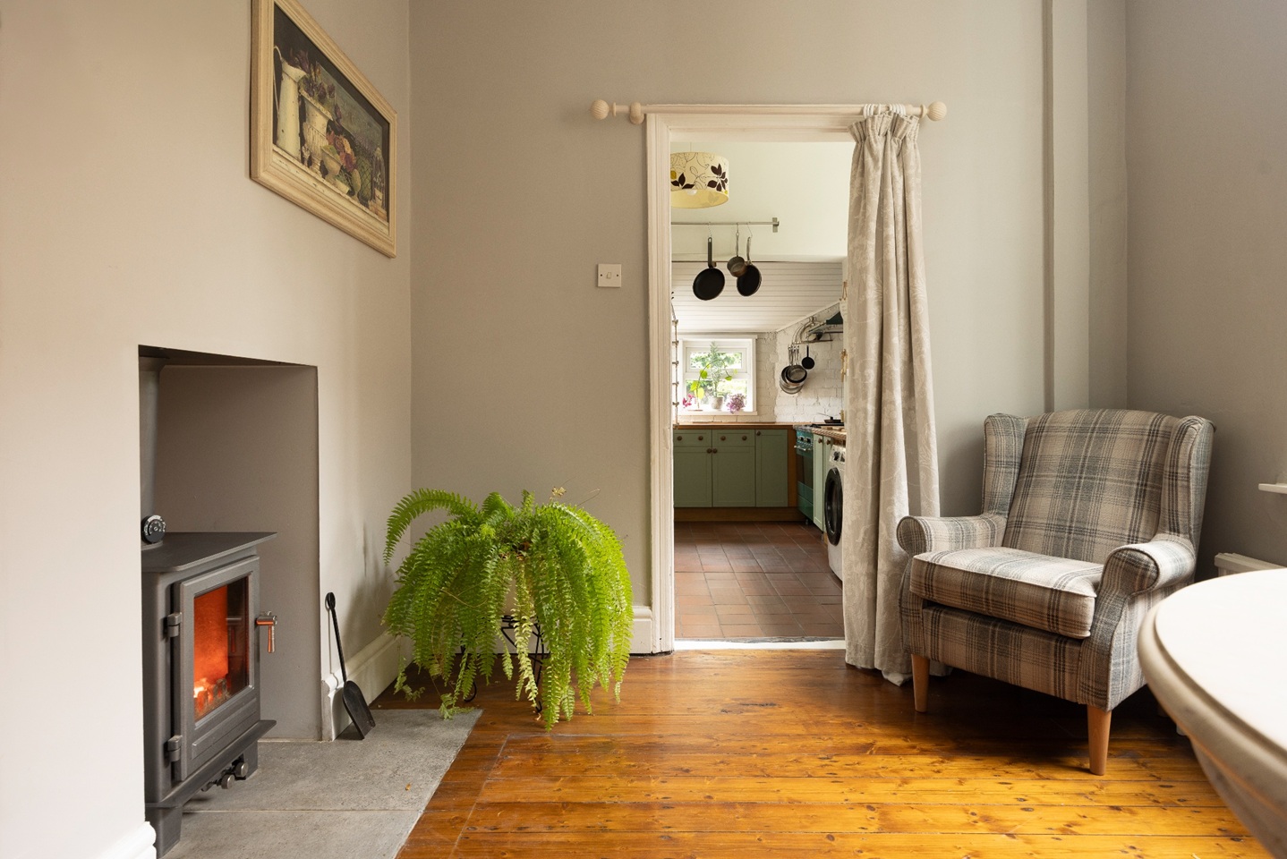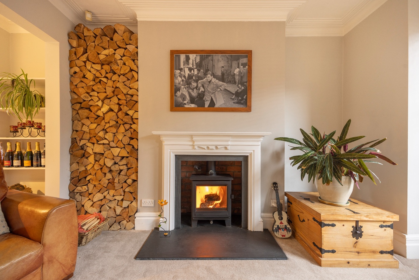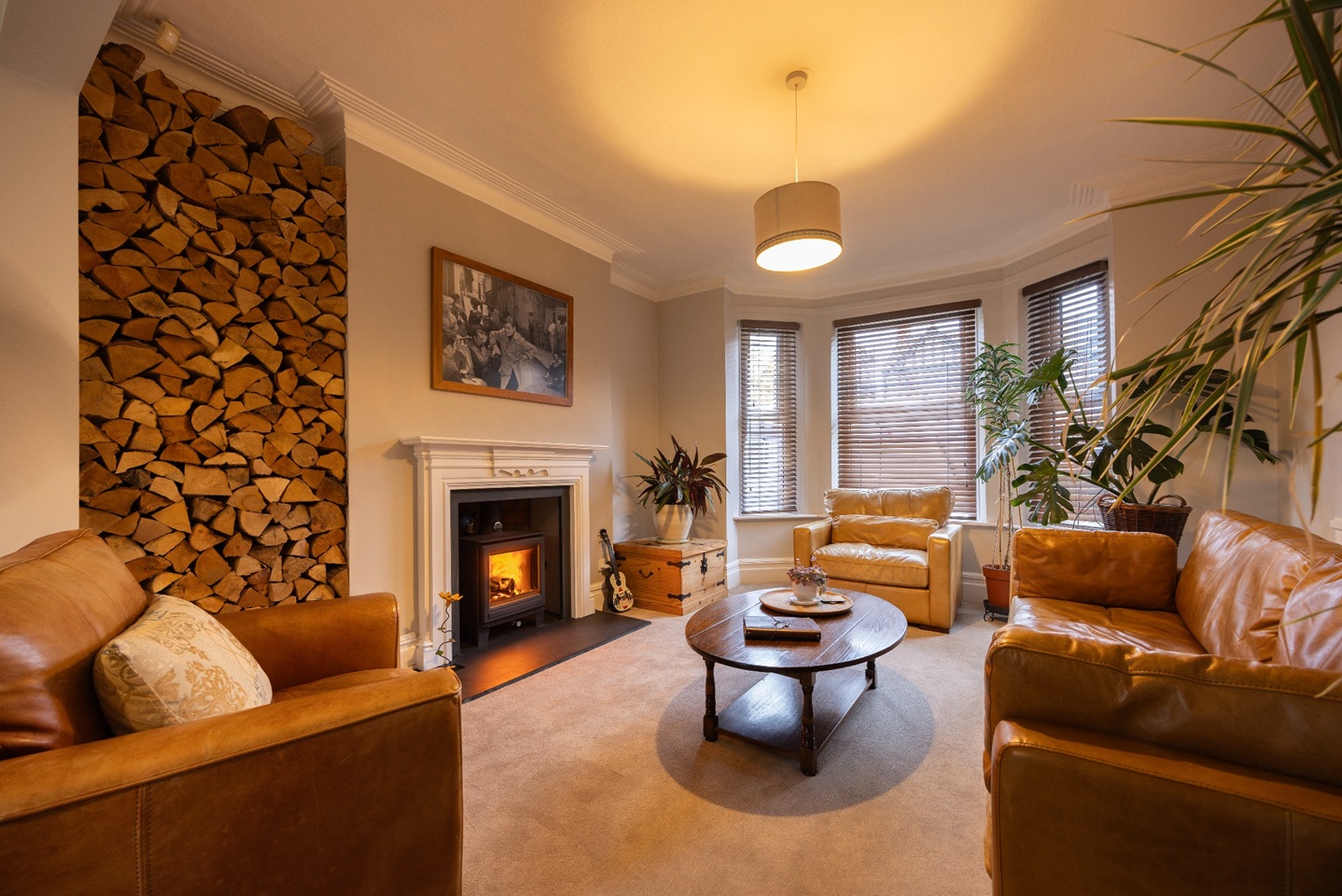 Large, bright, airy lounge with a wood burner, original fireplace, bay window & doors to the garden.