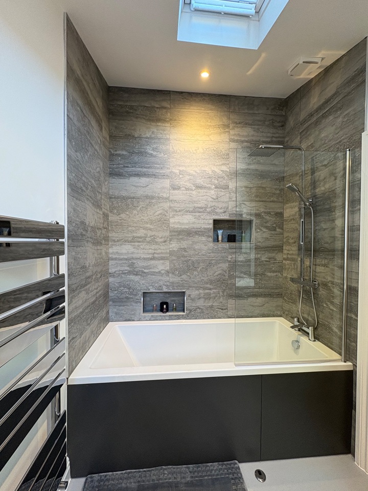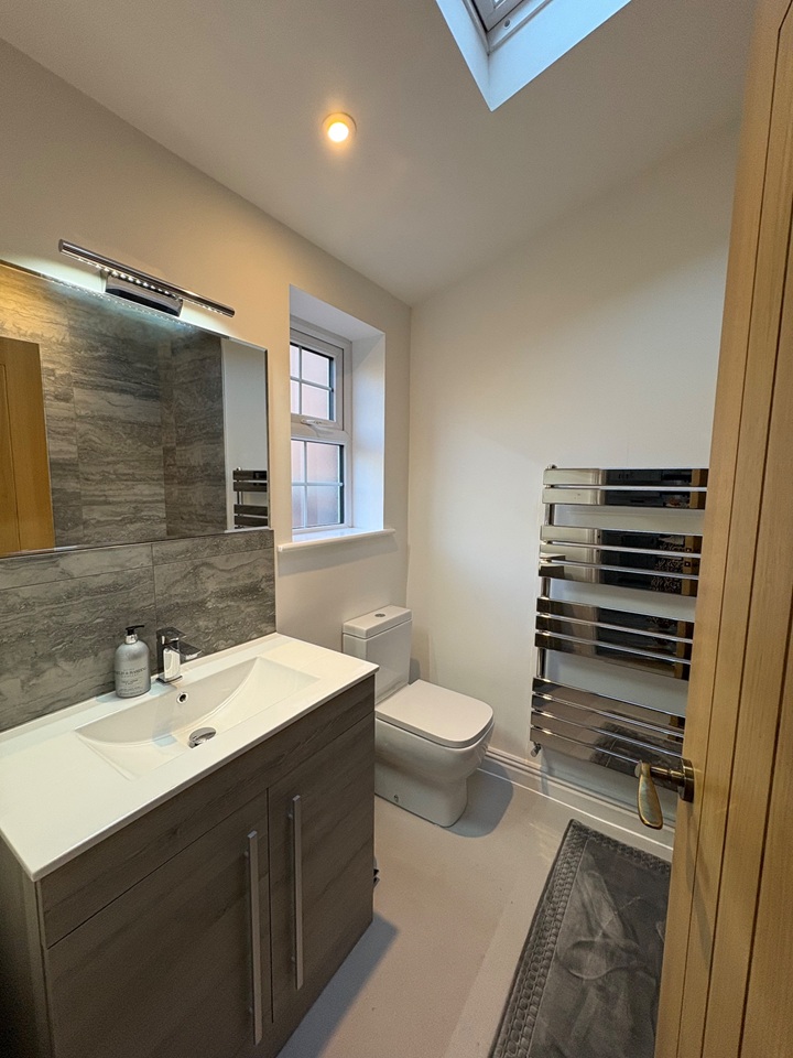 Leading off from the kitchen there is a large modern family bathroom again with a vaulted ceiling and plenty of natural light from the roof window. The modern bathroom suite is tiled with a large bath with a chrome thermostatic rain shower, chrome heated towel rail, large vanity unit and WC. To the first floor there are 2 generous sized double bedrooms. This recent full renovation project has managed to bring the property up to a very high standard of modern living yet held its original cottage charm.