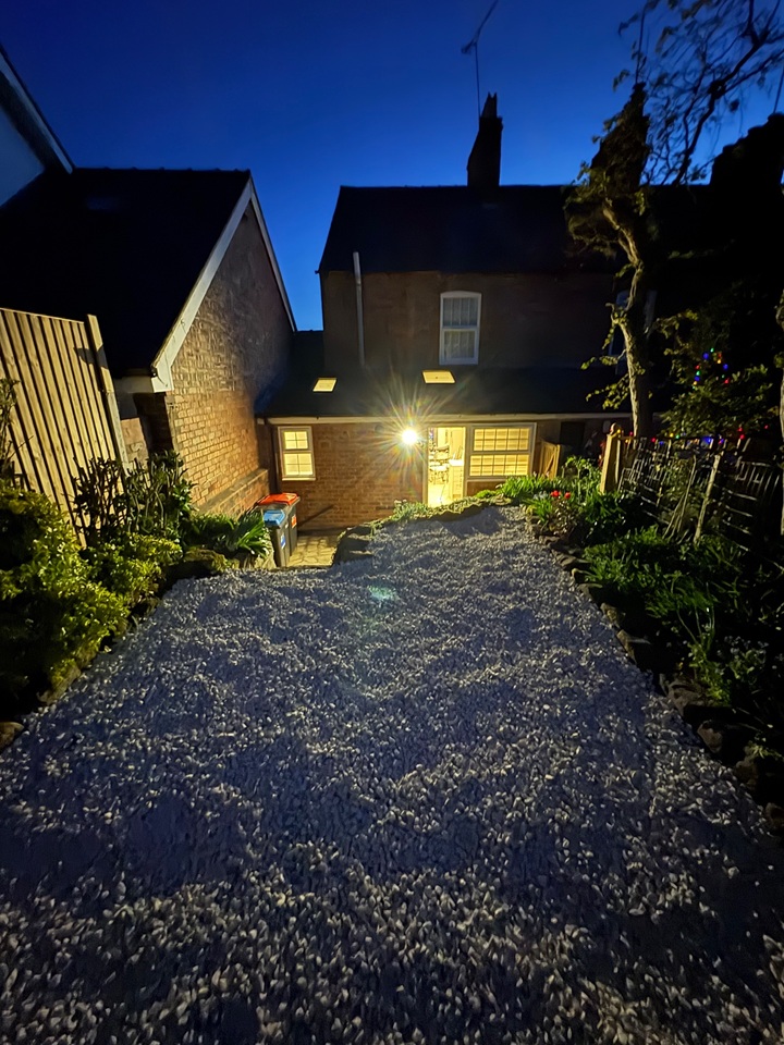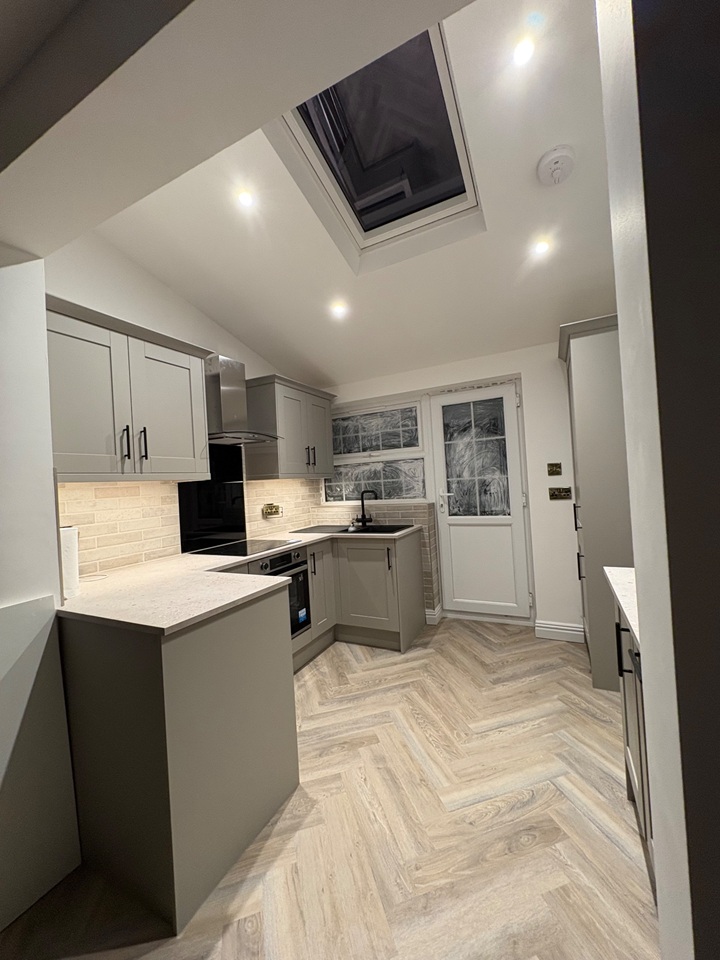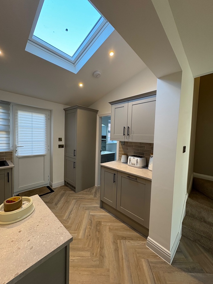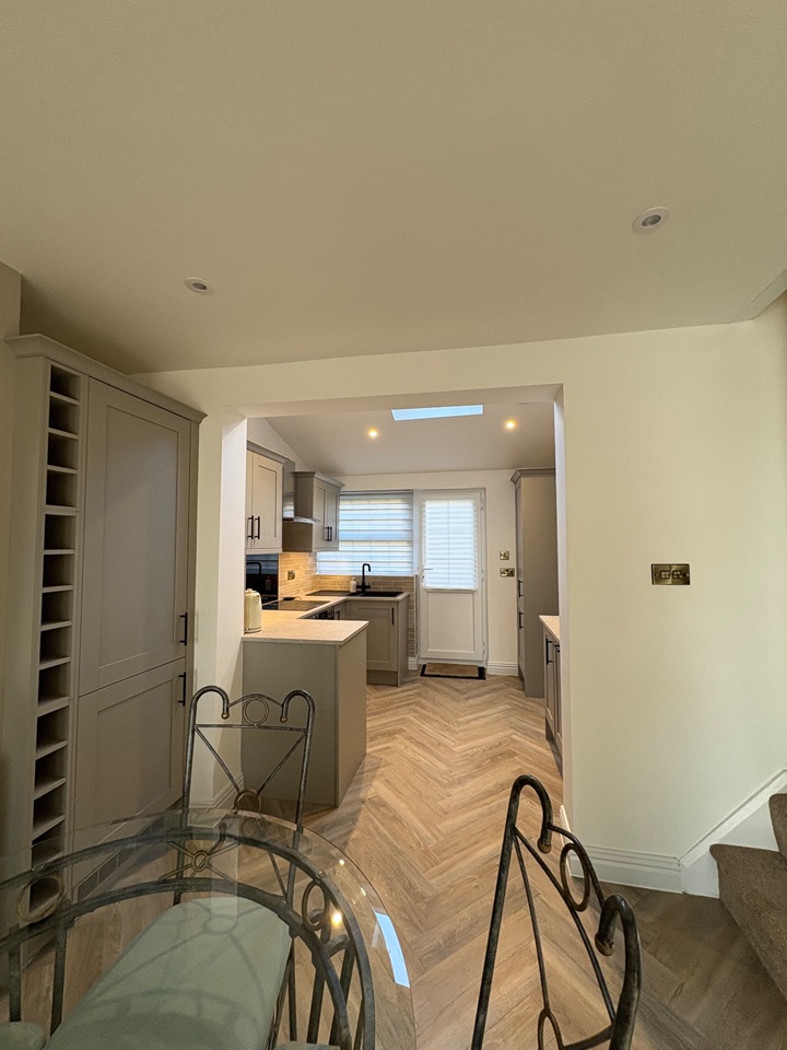 Entrance Porch leading to spacious open living /dining room which thereafter leads into the newly fitted open plan kitchen with built in appliances which has a vaulted roof and plenty of natural light from the velux roof window. The back door leads way onto an outside patio area and a raised mature private cottage garden.