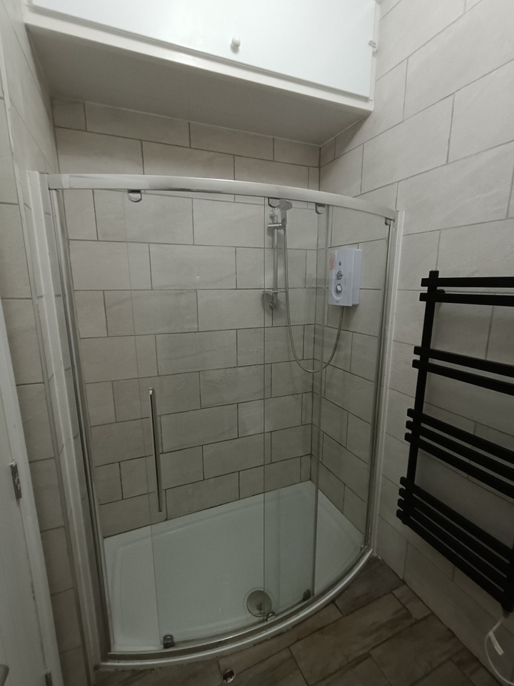- Contemporary shower room with large curved shower enclosure, stylish tiling, vanity basin unit and heated towel rail 🚿