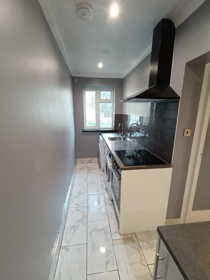 - Recently installed kitchen with modern white units, stone‑effect worktops, tiled floor and ample storage 🍽️