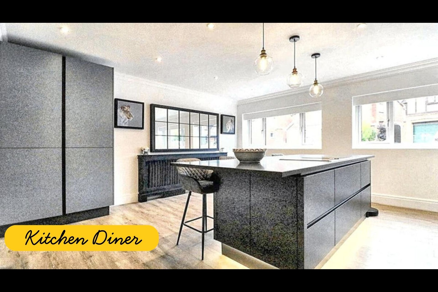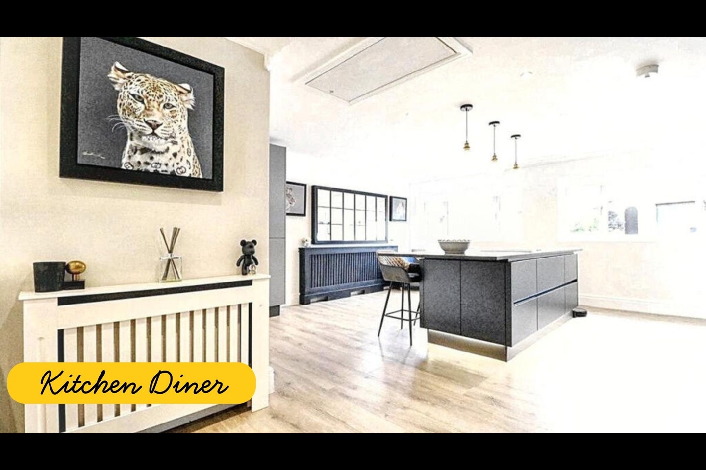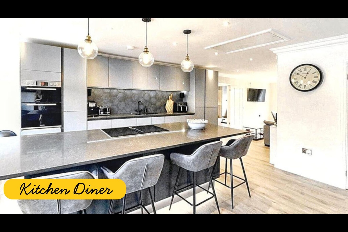 Expansive open-plan L-shaped kitchen and dining area with top-of-the-range integrated appliances and large island