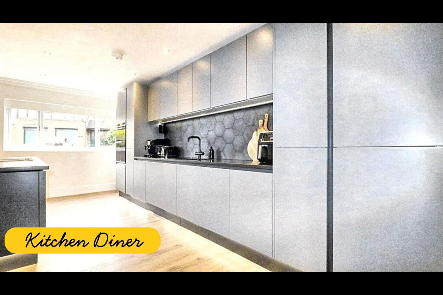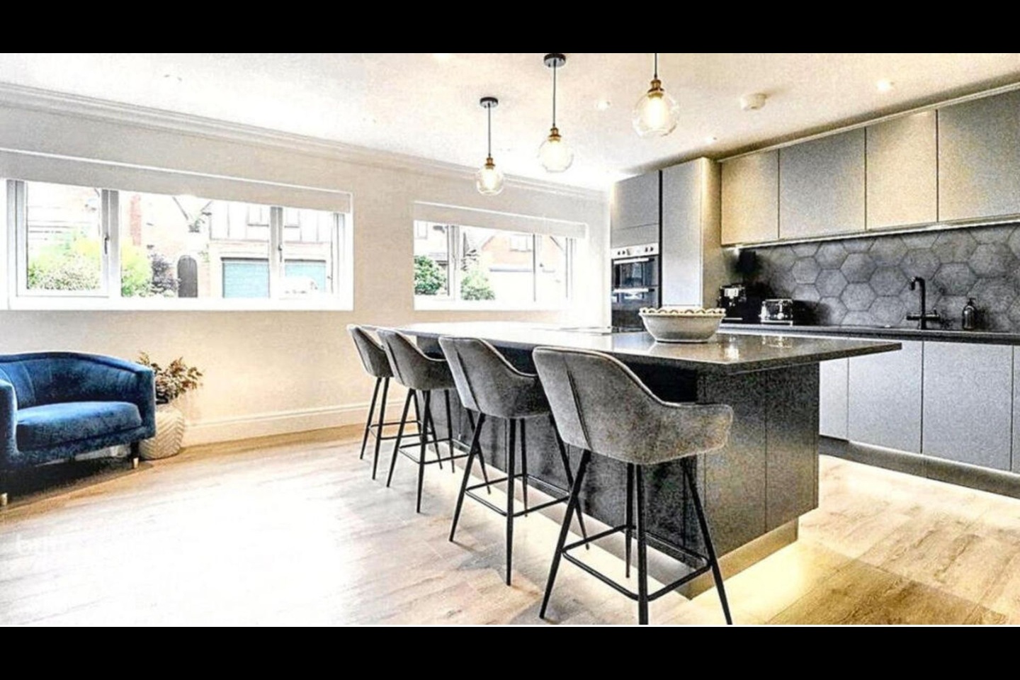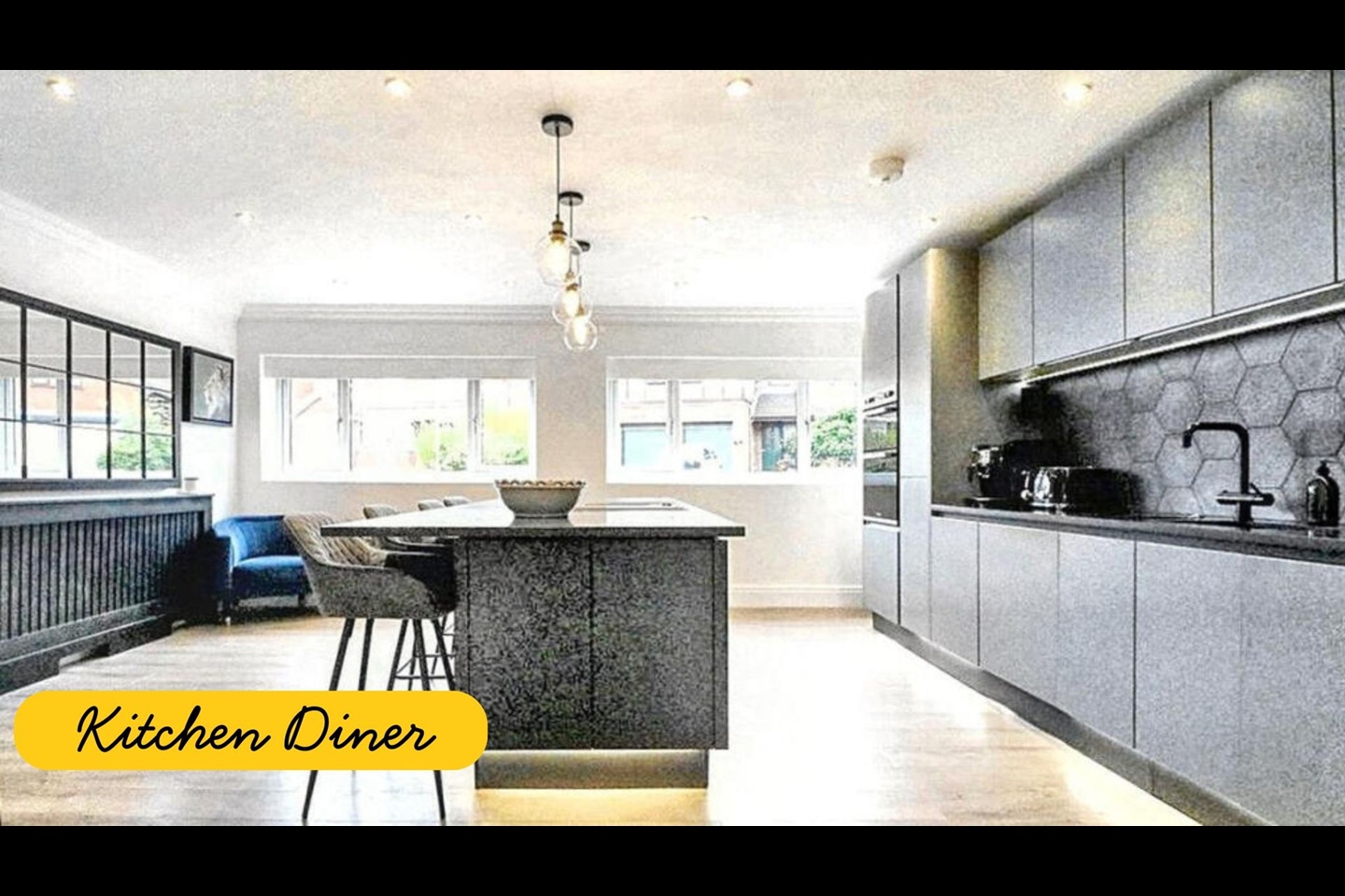 Expansive open-plan L-shaped kitchen and dining area with top-of-the-range integrated appliances and large island