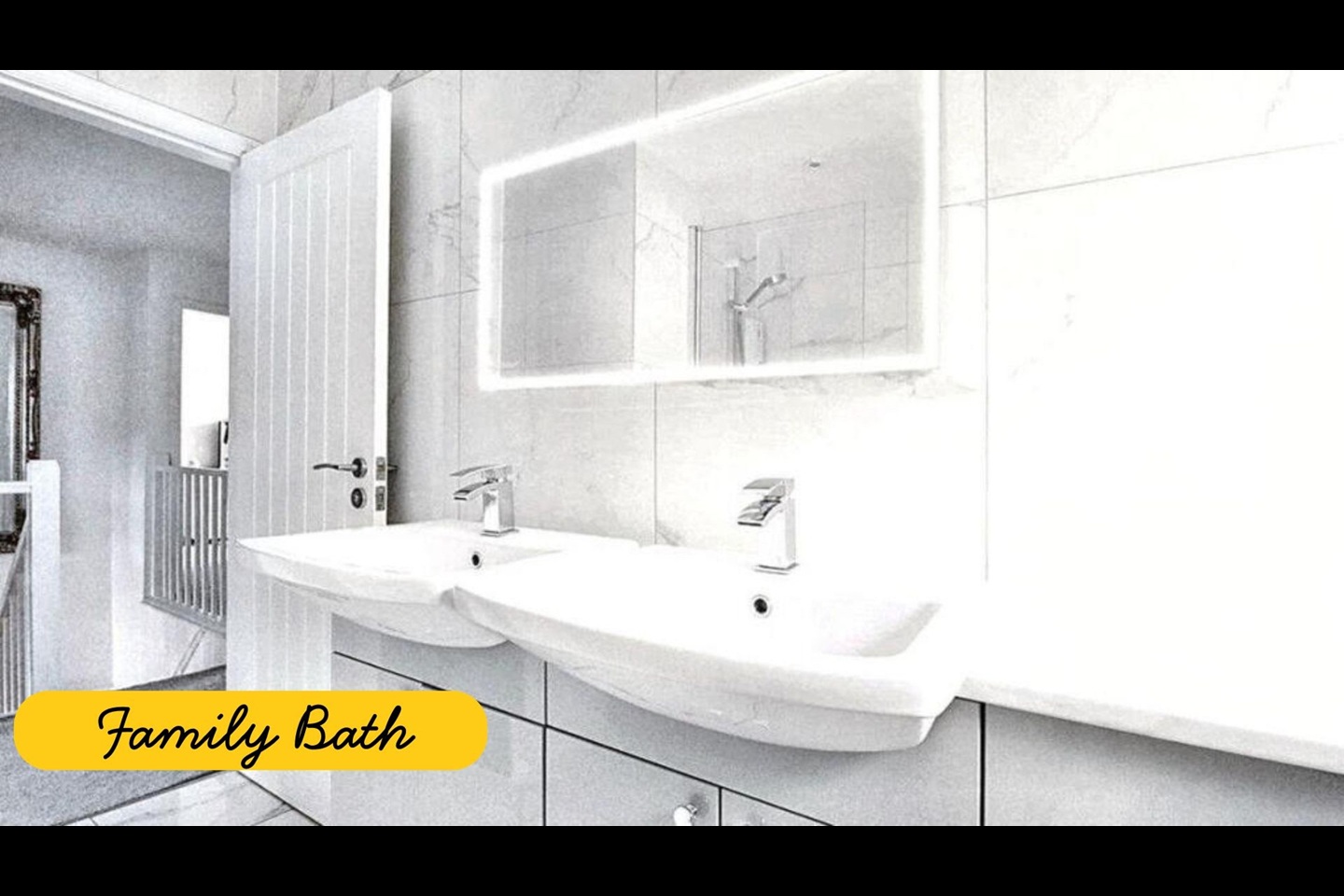 Family bathroom with contemporary fixtures, including his and hers sinks