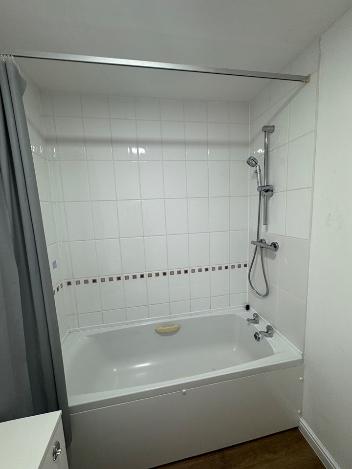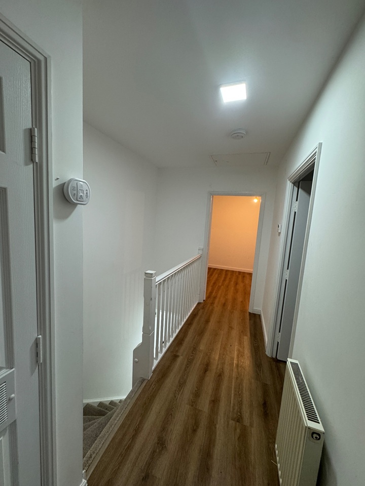Inside, the entrance hall and staircase lead to an upper hallway connecting to the spacious master bedroom with a large fitted wardrobe, a good-sized second bedroom, the modern bathroom with shower over the bath, and the open-plan living room, which includes additional storage space.