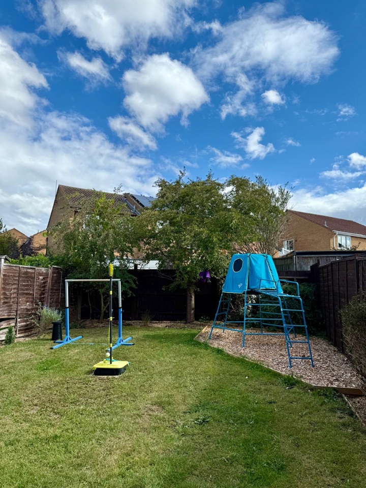Generous gardens: attractive front garden and a large rear garden with patio and easy-to-maintain borders (play equipment shown in photos not included)