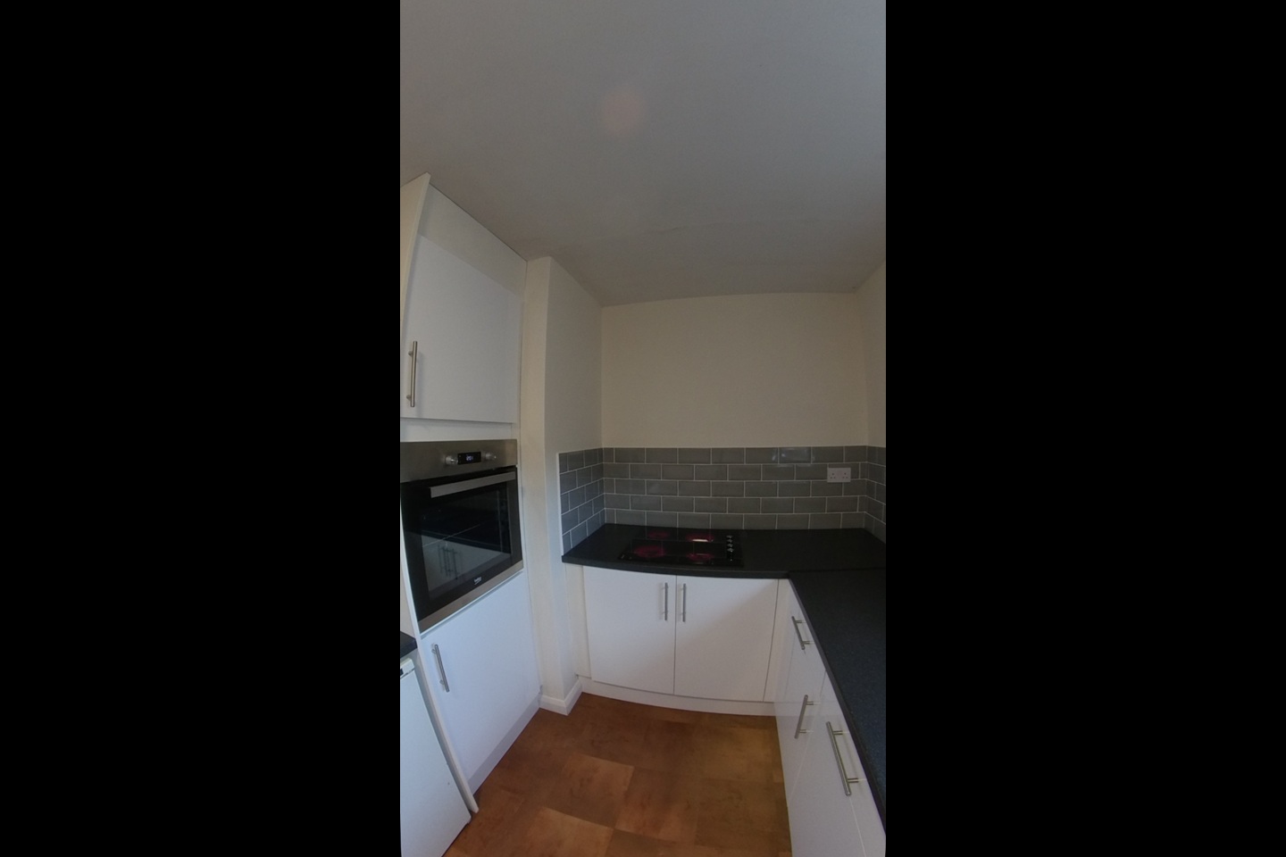 Fitted kitchen with oven, hob, and appliance spaces