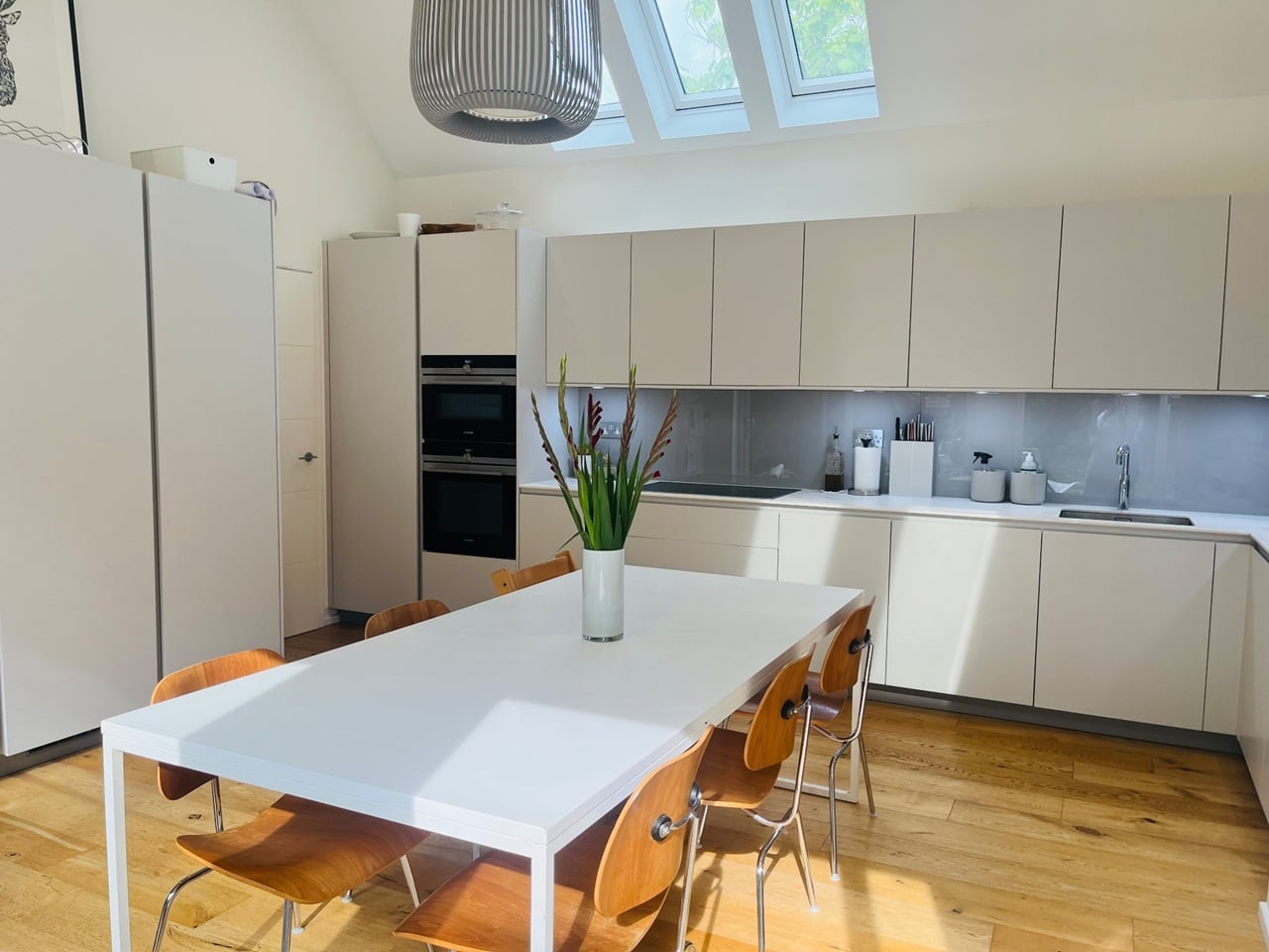 Beechwood offers comfortable open-plan living with lounge, kitchen and dining combined in one, sociable, light-filled space. High ceilings and a wall of glazed sliding doors create a modern, airy environment with views across a mature, well-screened garden.
