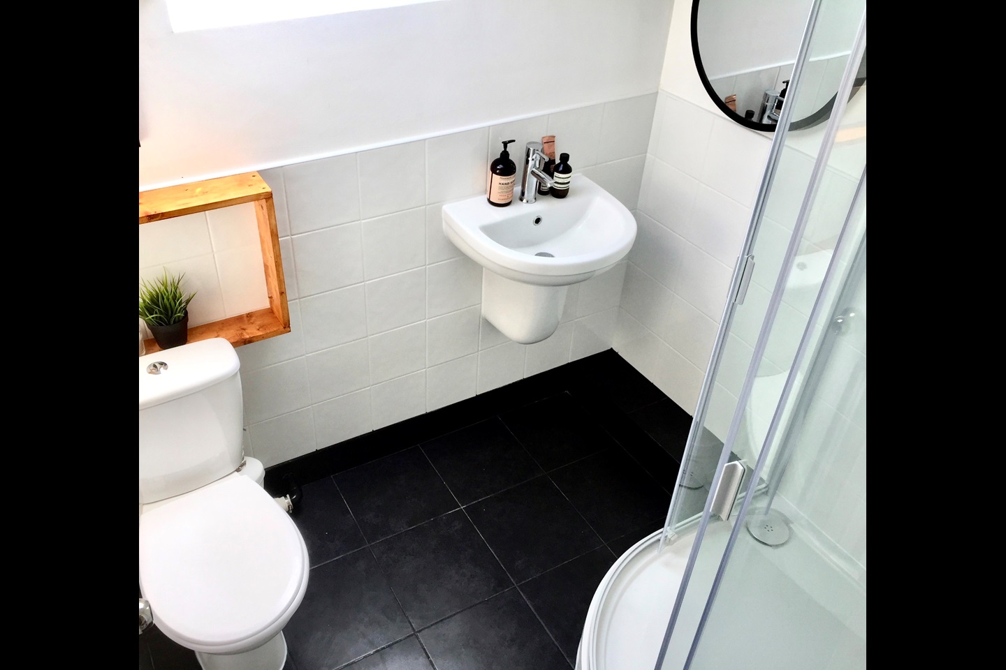 Bathroom is a full white suite comprising WC, wash hand basin and overhead waterfall shower.