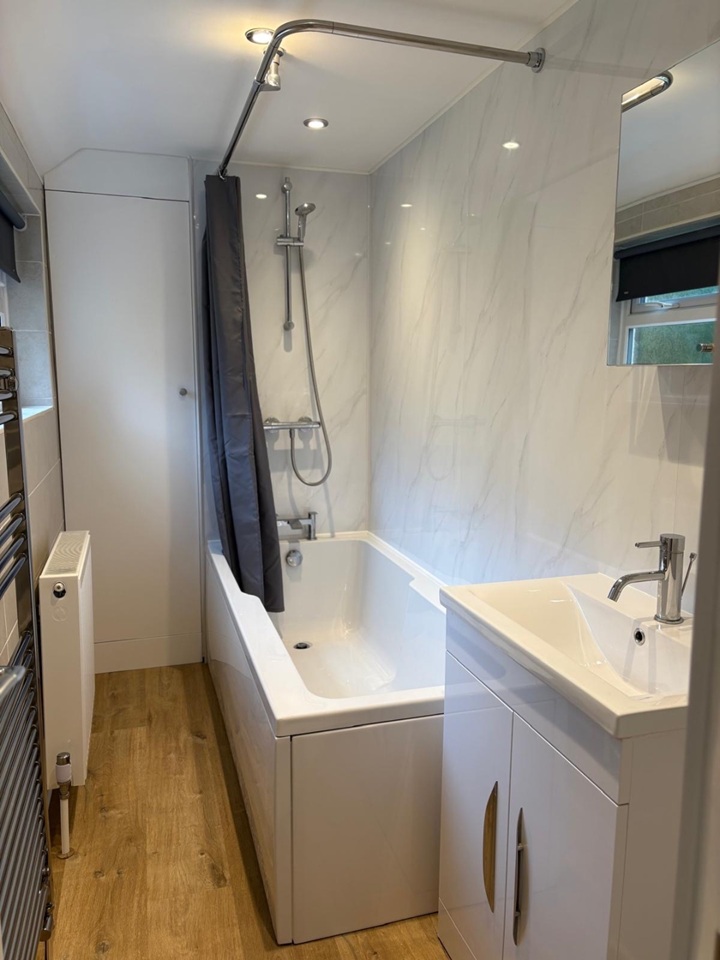 Newly installed bathroom with wide bath and fitted shower, basin and clothes rail.