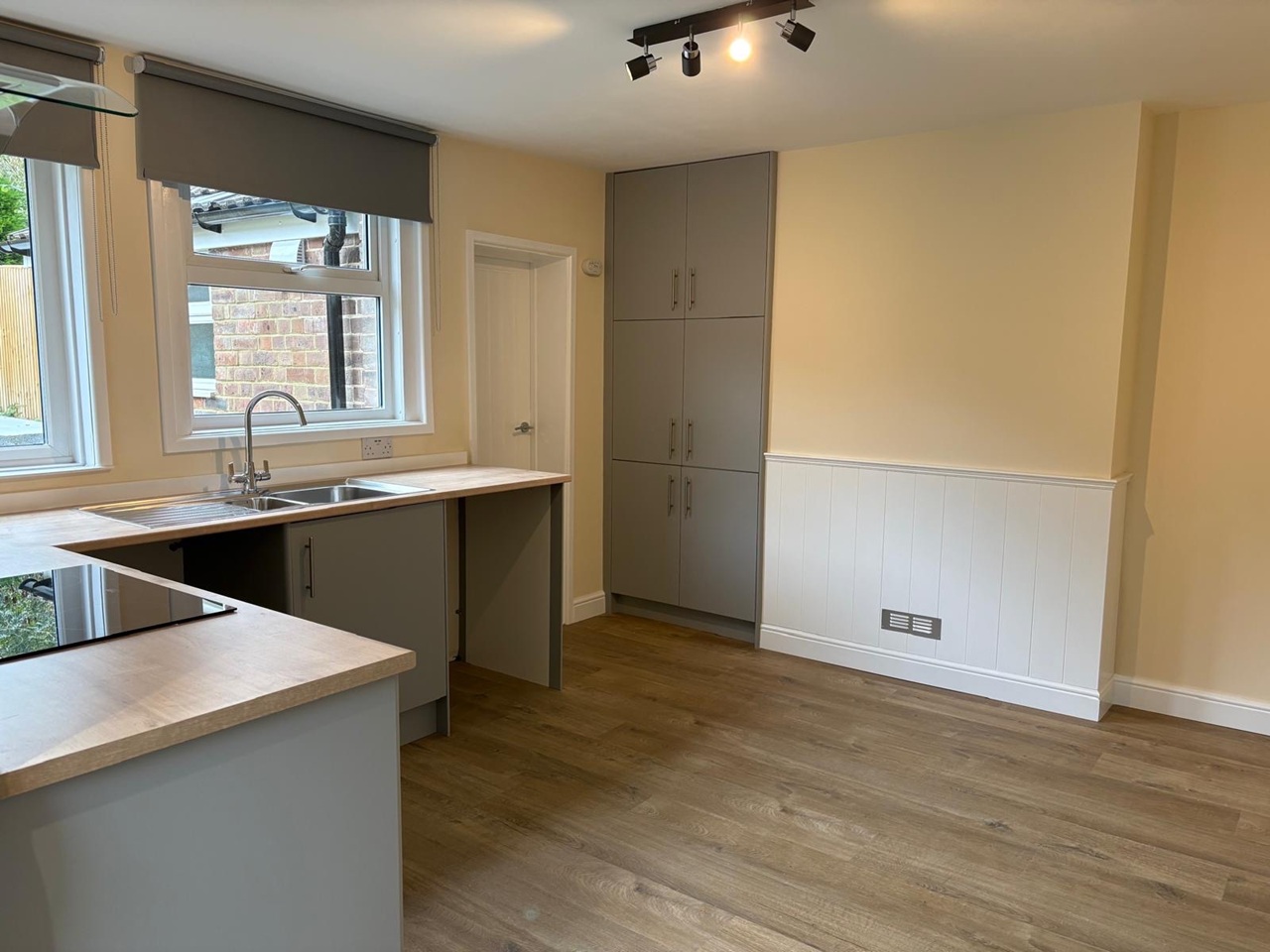 Kitchen has been newly installed with an electric hob and oven, plumbing for a dishwasher and washing machine. Space for a fridge freezer and table and chairs.