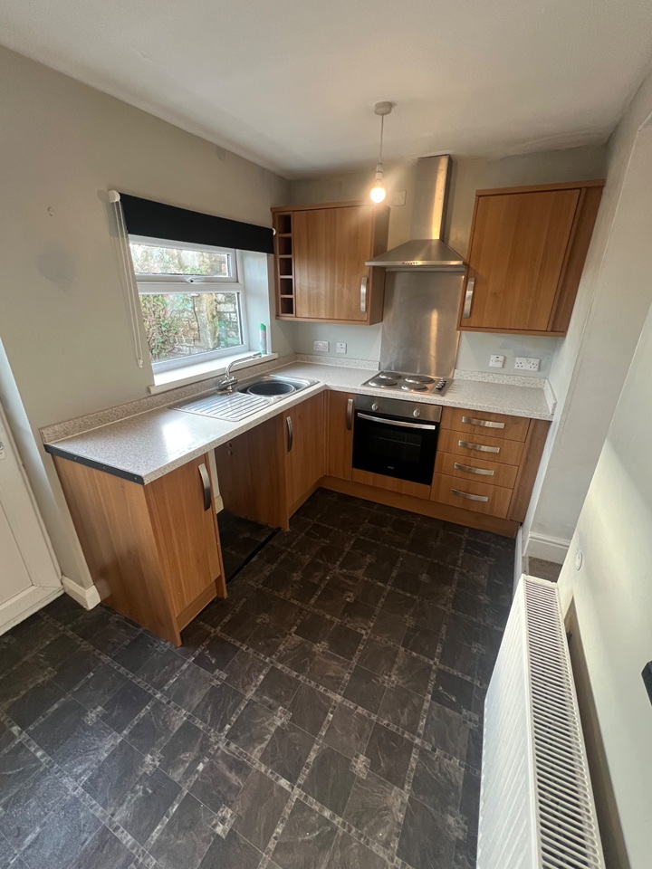 - Fitted kitchen with integrated electric oven and hob.