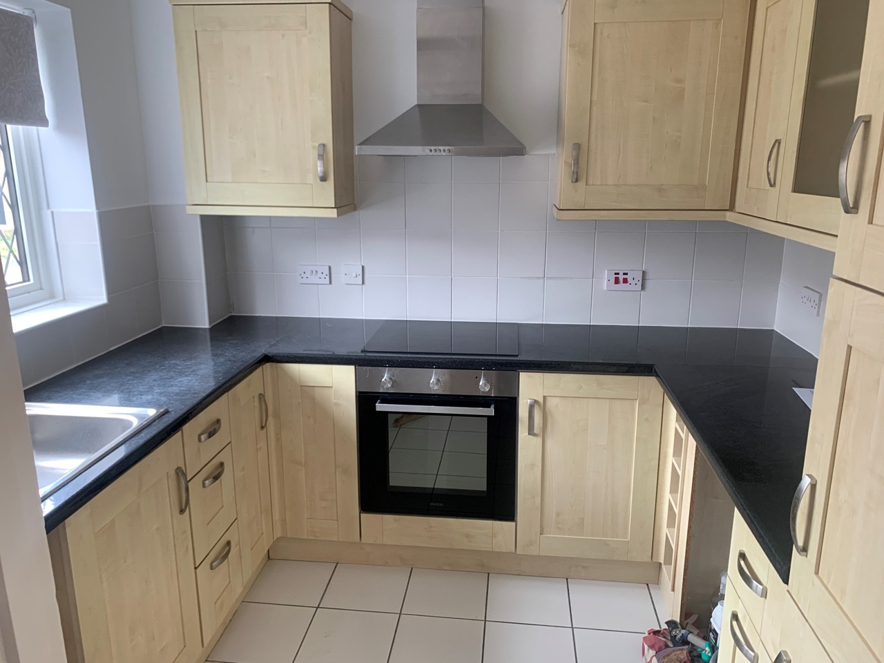 Kitchen with new oven, hob, extractor and sink.