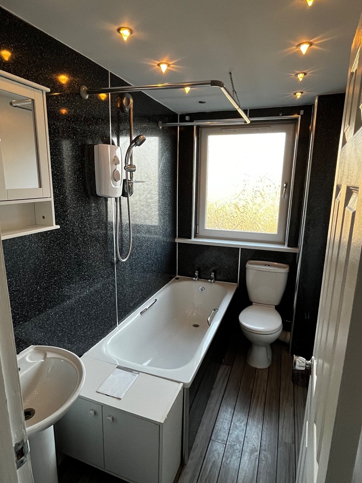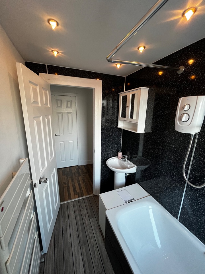 i. Modern 3 piece bathroom with heated towel rail and shower over bath