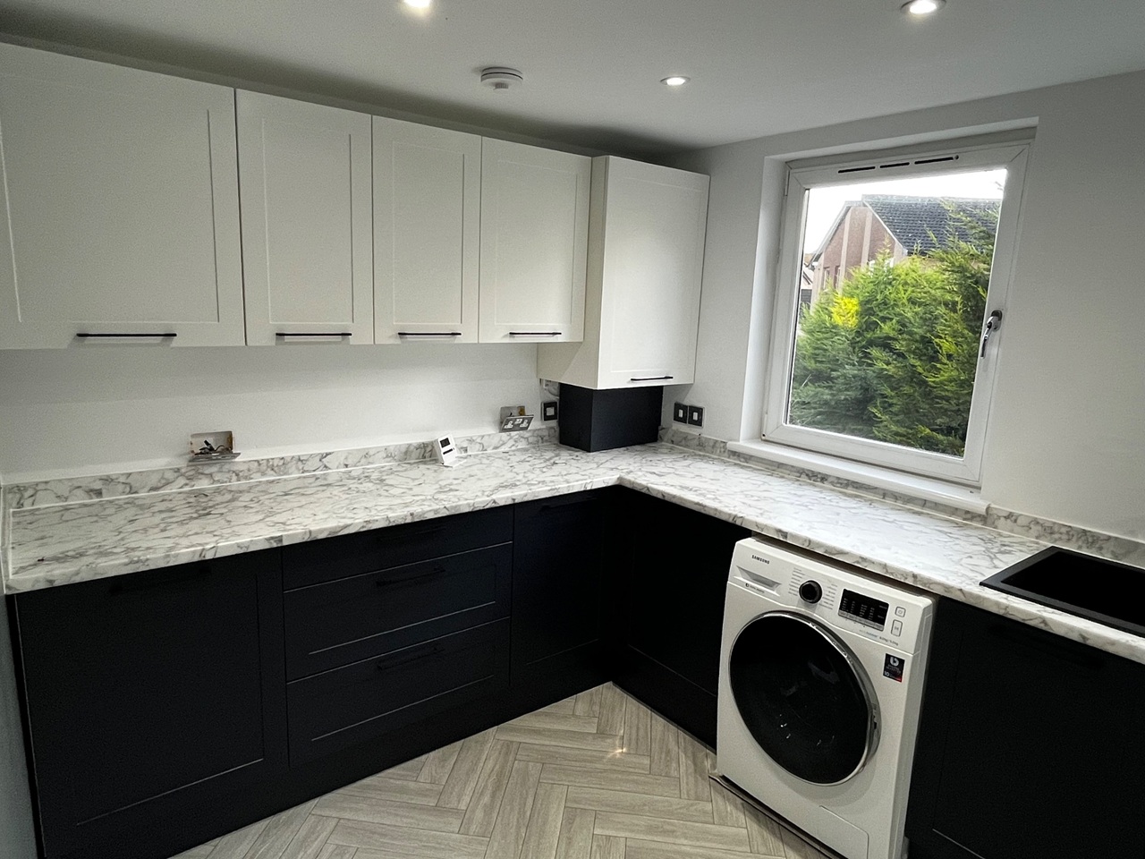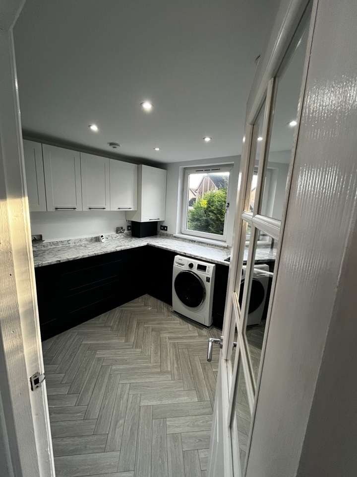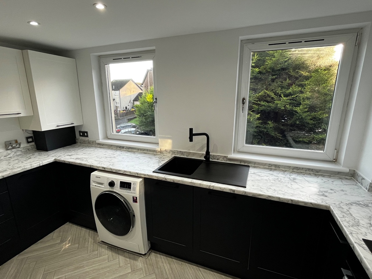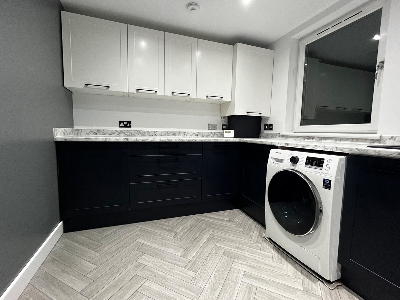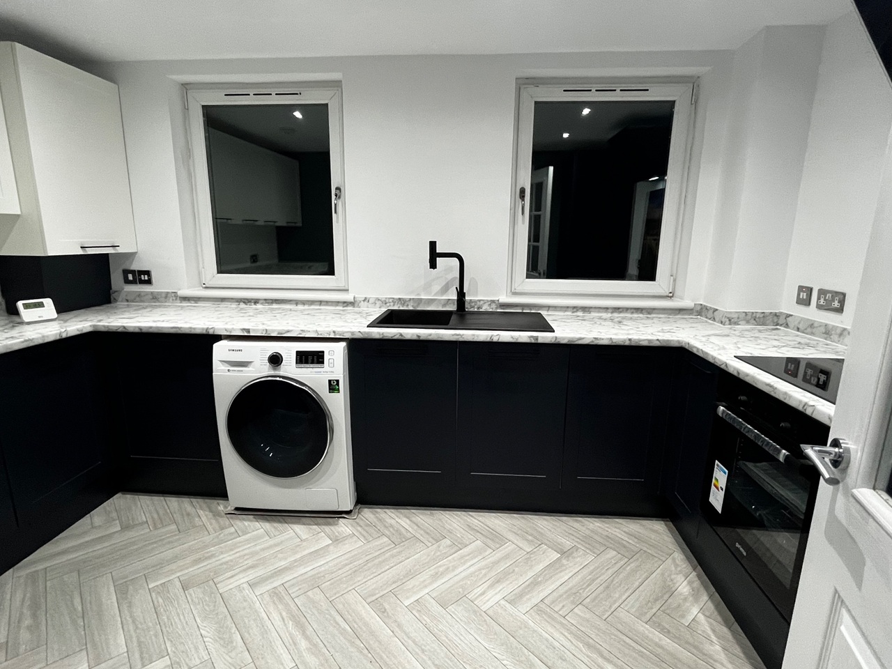i. Modern kitchen with built in oven, washing machine, tumble dryer, fridge freezer,