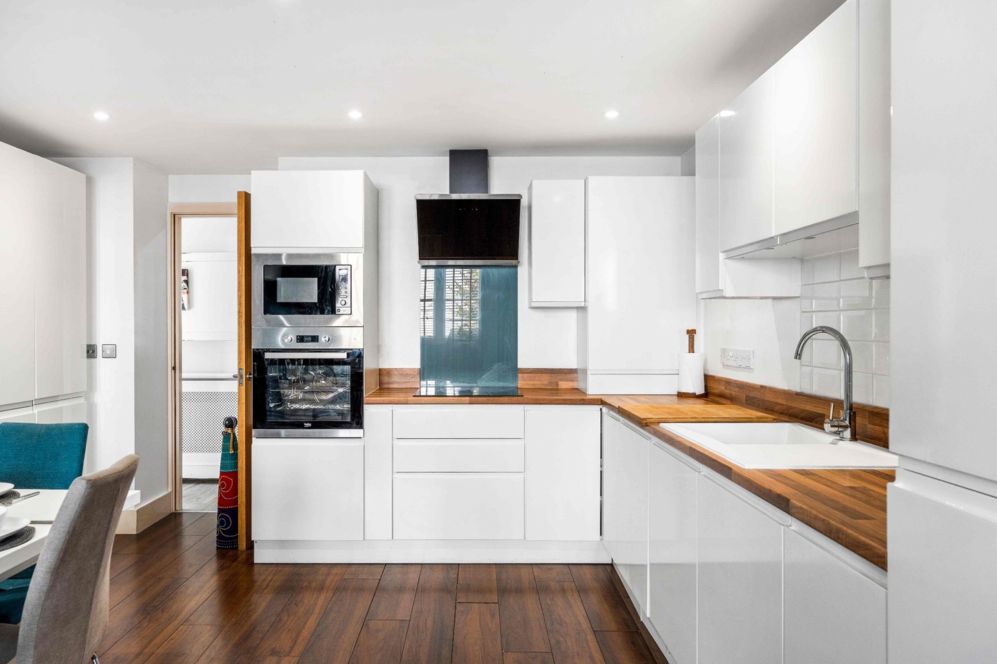 Inside, the open-plan living space is modern, colourful, and full of personality. Bright feature walls, contemporary furnishings, and unique décor pieces create a welcoming atmosphere. The lounge invites you to unwind with a large corner sofa, Smart TV, and even a piano for those who like to add a musical touch to their stay. The sleek, fully equipped kitchen with warm wooden worktops and a generous dining area makes it easy to enjoy meals together. Both bedrooms are beautifully styled with statement artwork, plush bedding, and plenty of natural light, offering comfort and character in equal measure. Two bathrooms add extra convenience for groups.