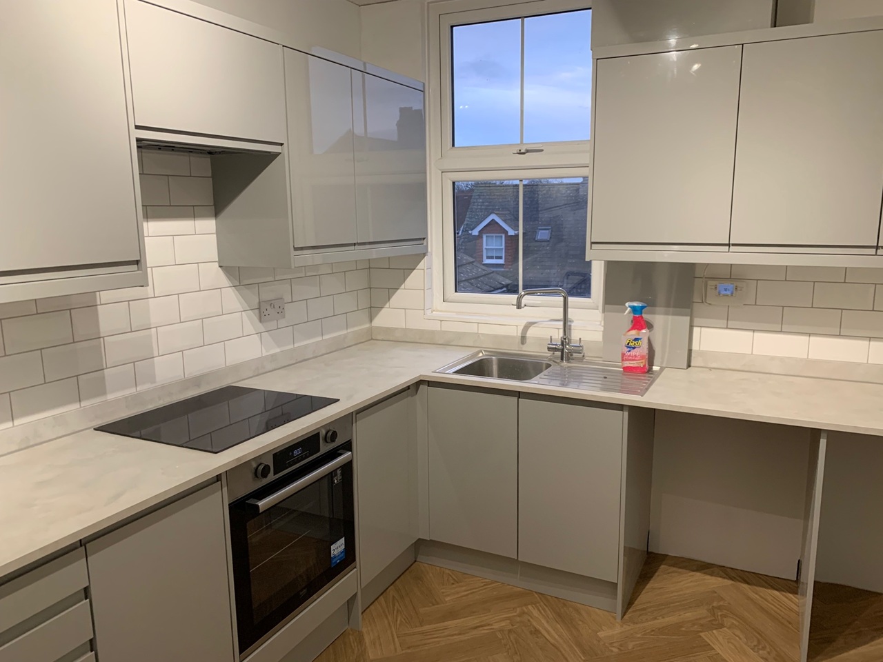 A STYLISHLY REFURBISHED GREY MODERN KITCHEN IS OF GOOD PROPORTIONS WITH PLENTY OF ROOM FOR A SMALL TABLE. PLUMBING FOR DISHWASHER AND WASHING MACHINE.