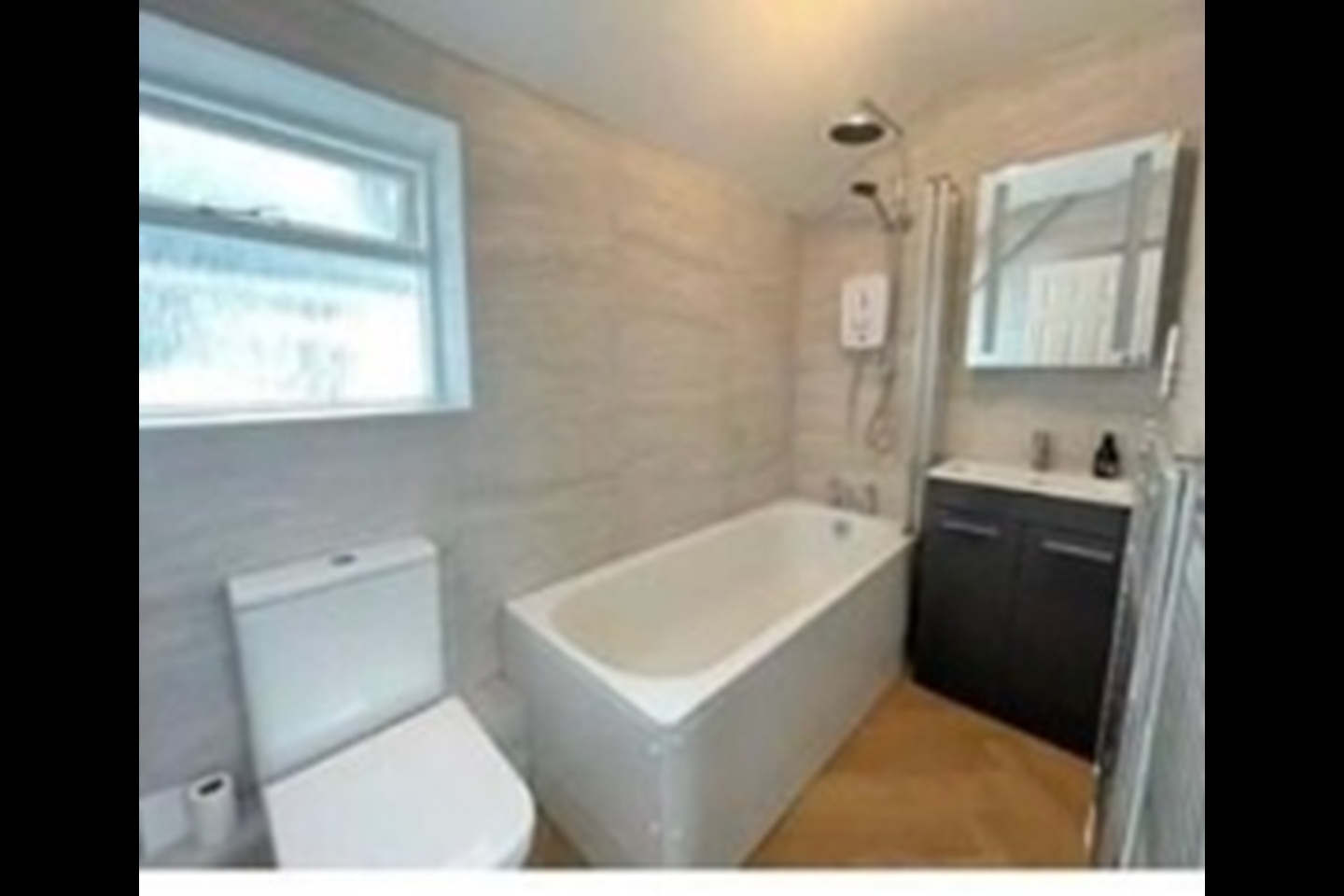REFURBISHED BATHROOM, IT HAS A LOVELY GREY SINK UNIT AND LIGHT UP CABINET. A BATH AND OVERHEAD SHOWER, TILED IN GREY