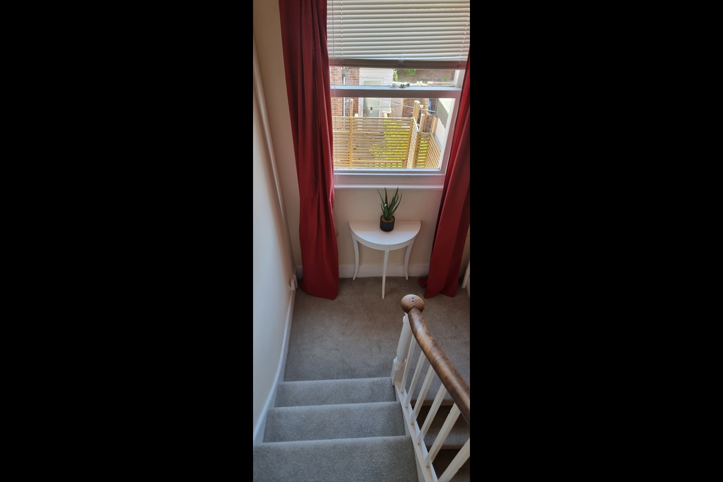 Outside there is a decked garden with a large bay tree.