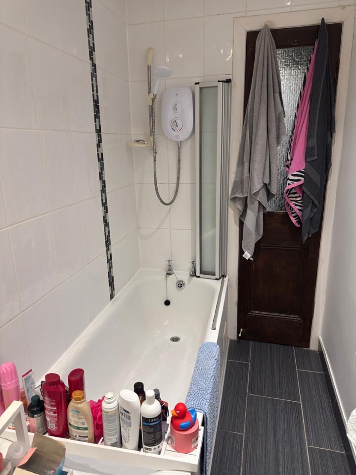Bathroom with shower over bath.