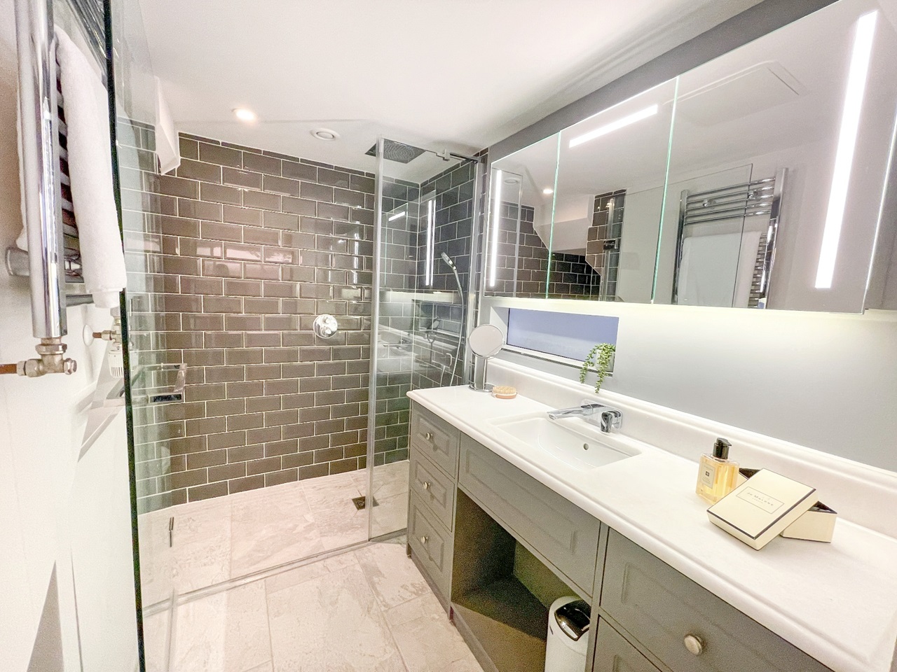 - Modern shower room with marble vanity, heated towel rail, and illuminated mirror.