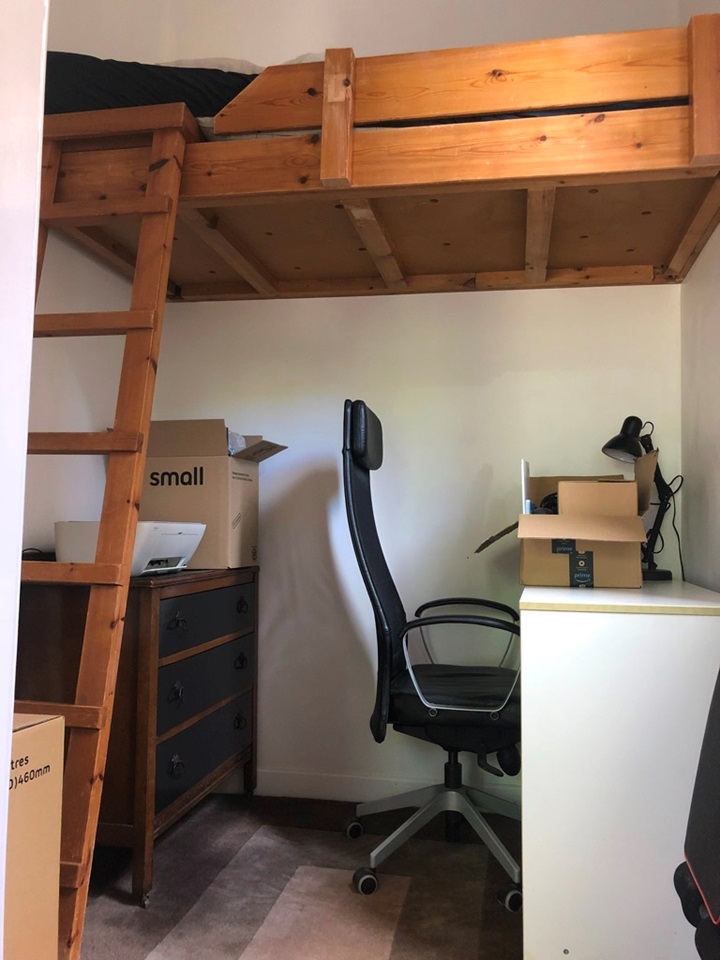 There is a large master bedroom and a second room set up as a studio for home working but that can double as a guest bedroom with a small mezzanine bed installed.