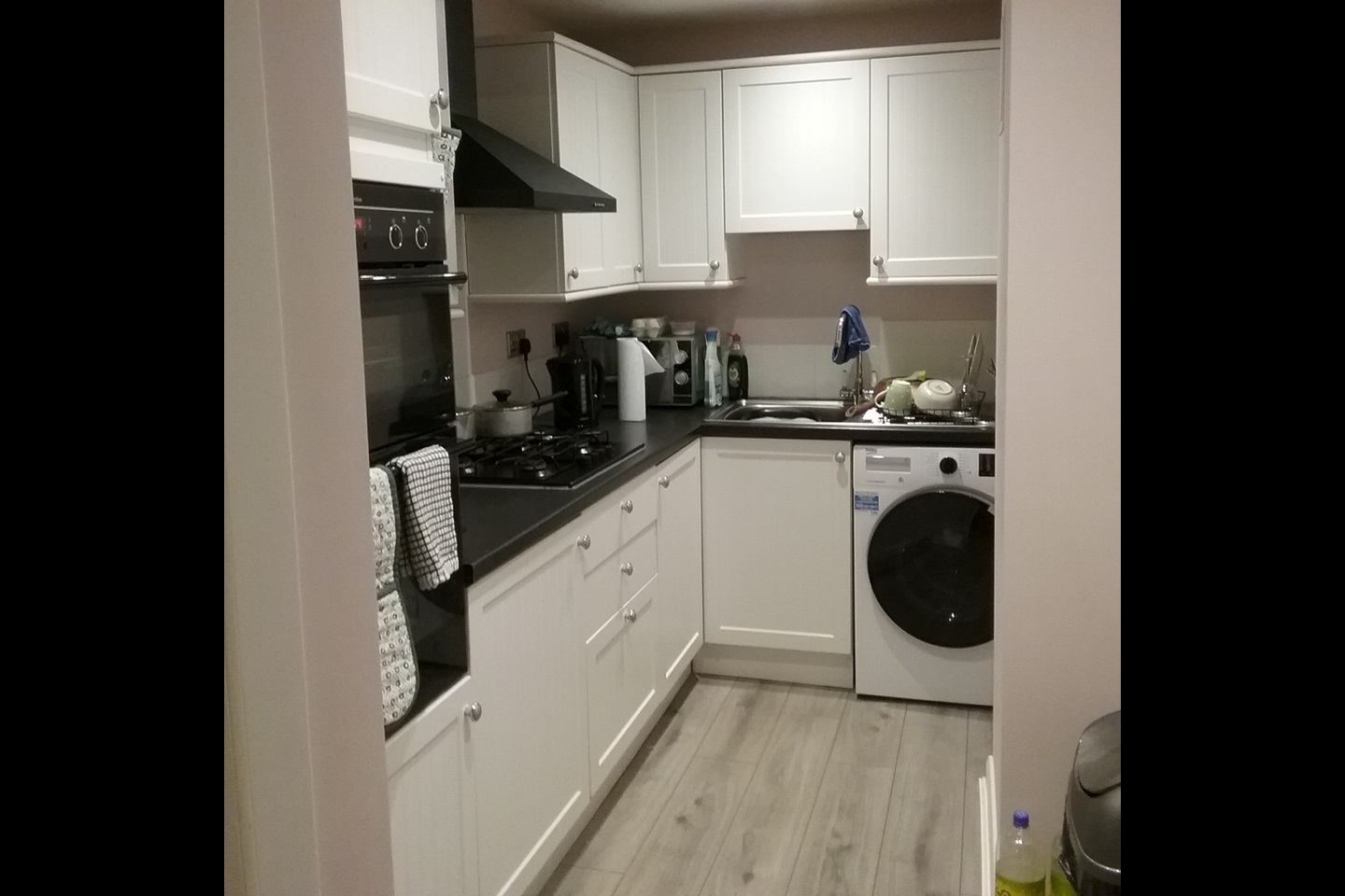 Compact kitchen with large 50/50 fridge freezer, clothes washer/dryer, built in double electric oven and gas hob.