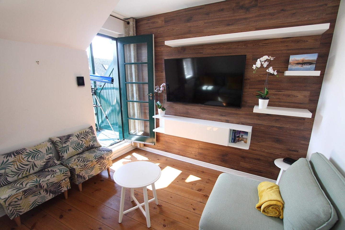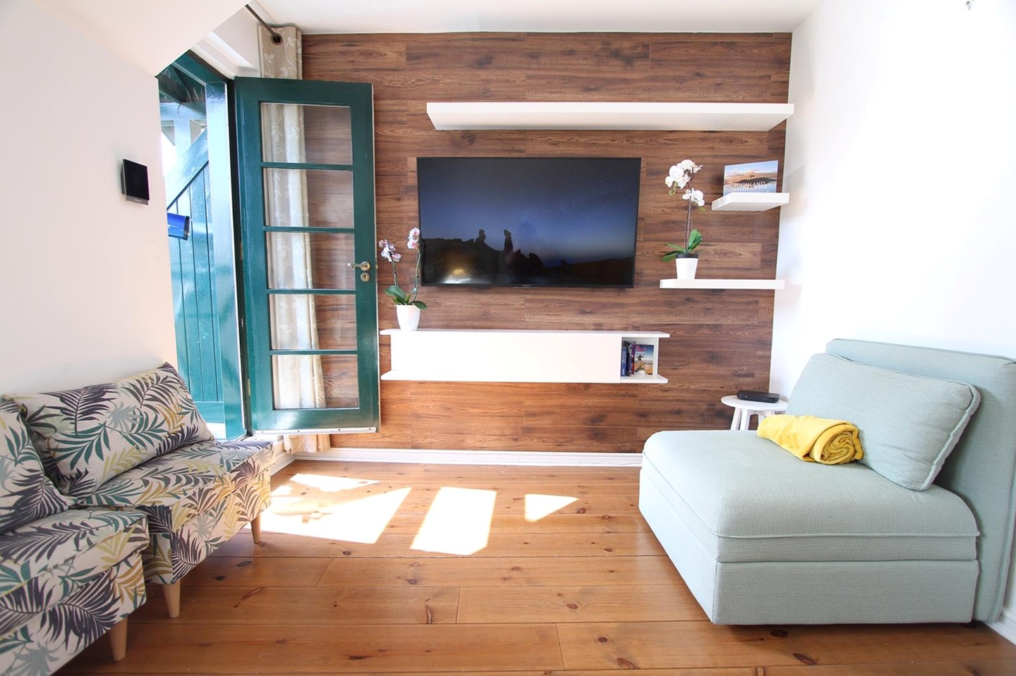 Bright, generous, and welcoming, featuring a balcony with city views, a 55" Ultra HD 4K TV, and a sofa bed (seats five).