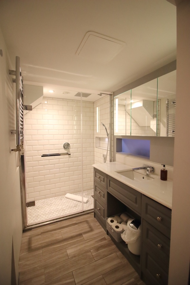 - Modern shower room with marble vanity, heated towel rail, and illuminated mirror.