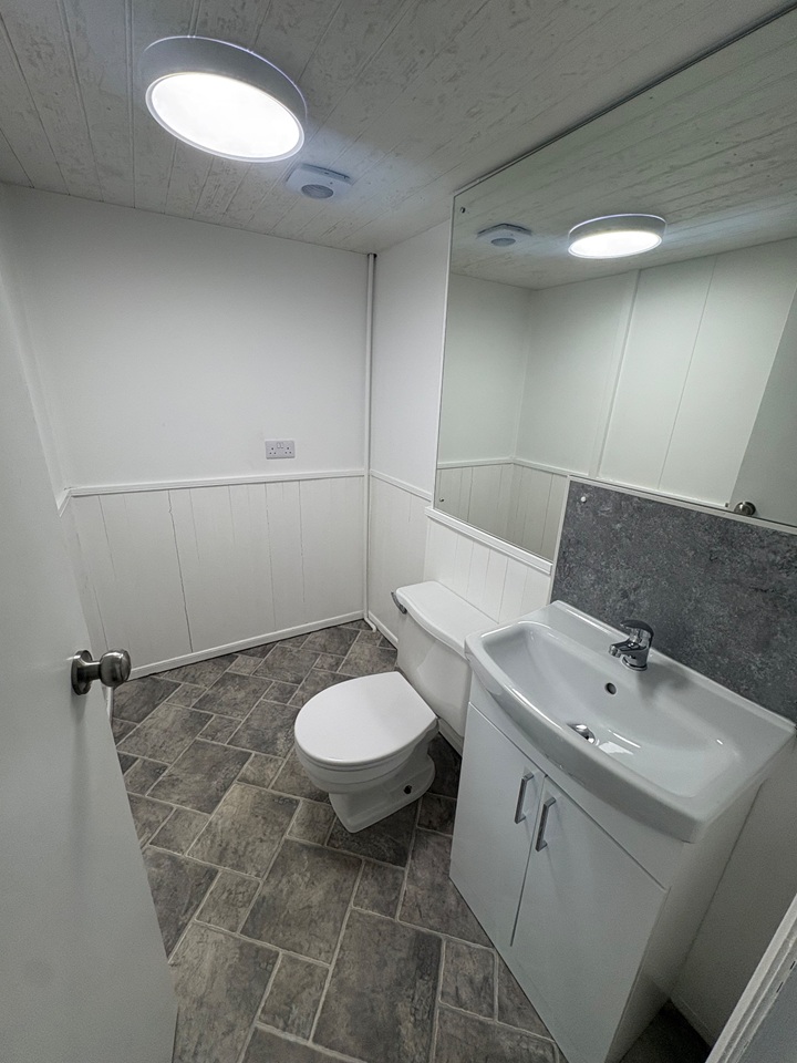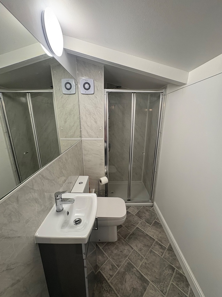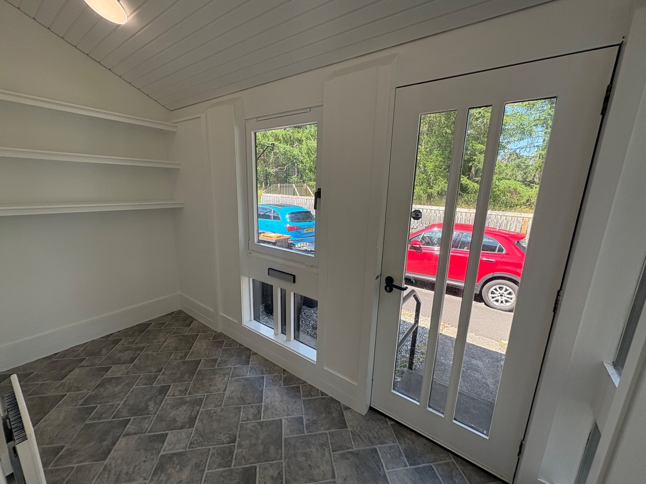On the lower level, the property boasts a bright and spacious entrance porch that leads into a large living room and modern kitchen. This large, versatile space is perfect for both family life and entertaining. The kitchen is well-equipped with ample storage, and it opens out onto a generous garden area, complete with additional storage. The ground floor also features a modern cloakroom complete with a toilet and hand basin.