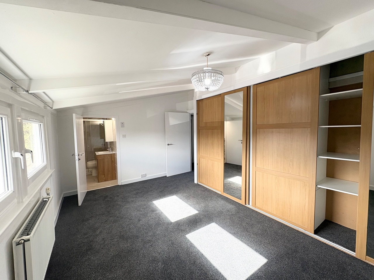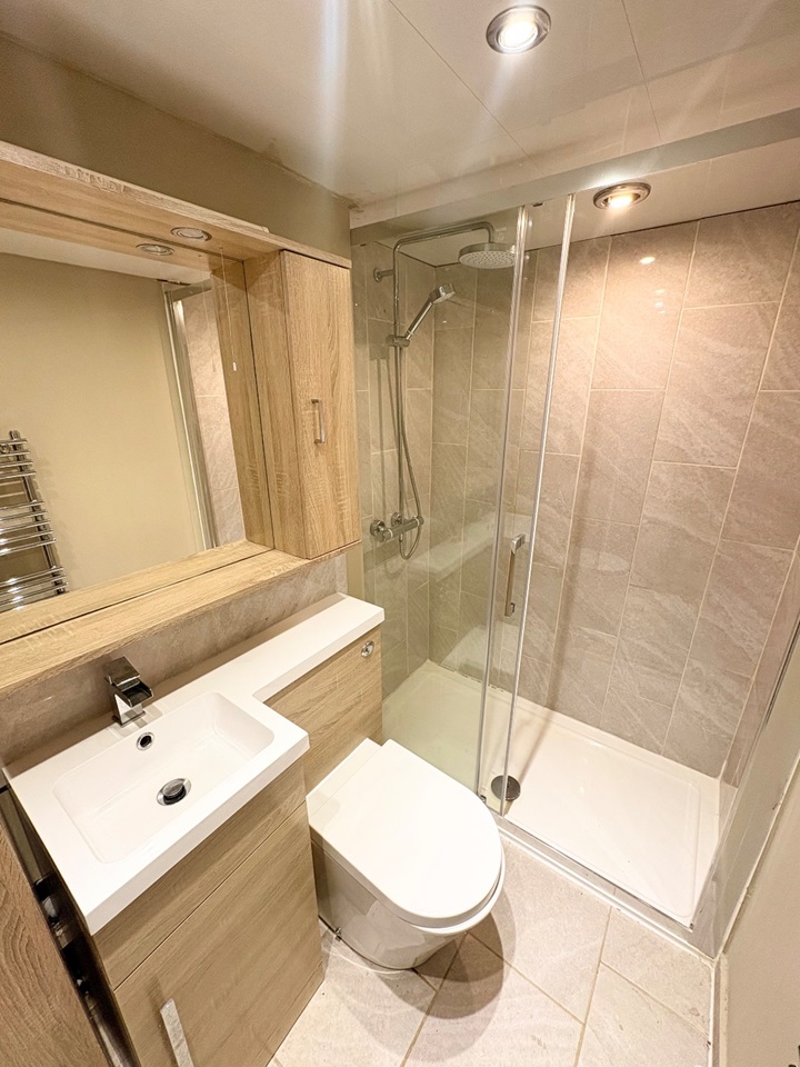On the lower level, the property boasts a bright and spacious entrance porch that leads into an open-plan kitchen, dining, and living area. This large, versatile space is perfect for both family life and entertaining. The kitchen is well-equipped with ample storage, and it opens out onto a generous garden area, complete with additional storage. The ground floor also features a modern bathroom with a walk-in shower, ideal for added convenience.