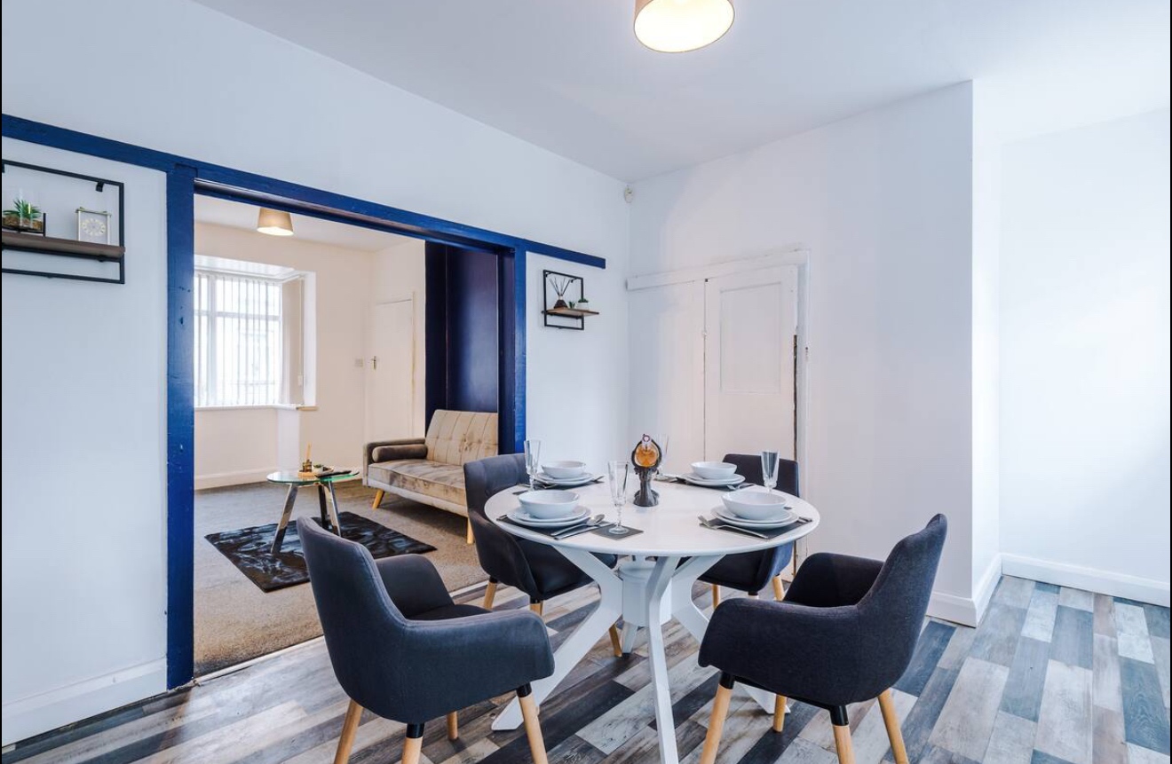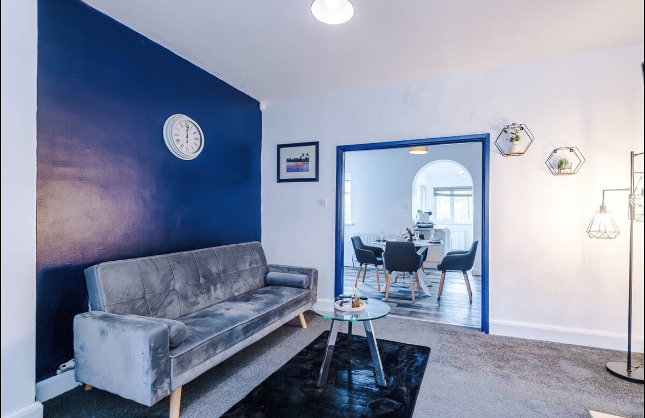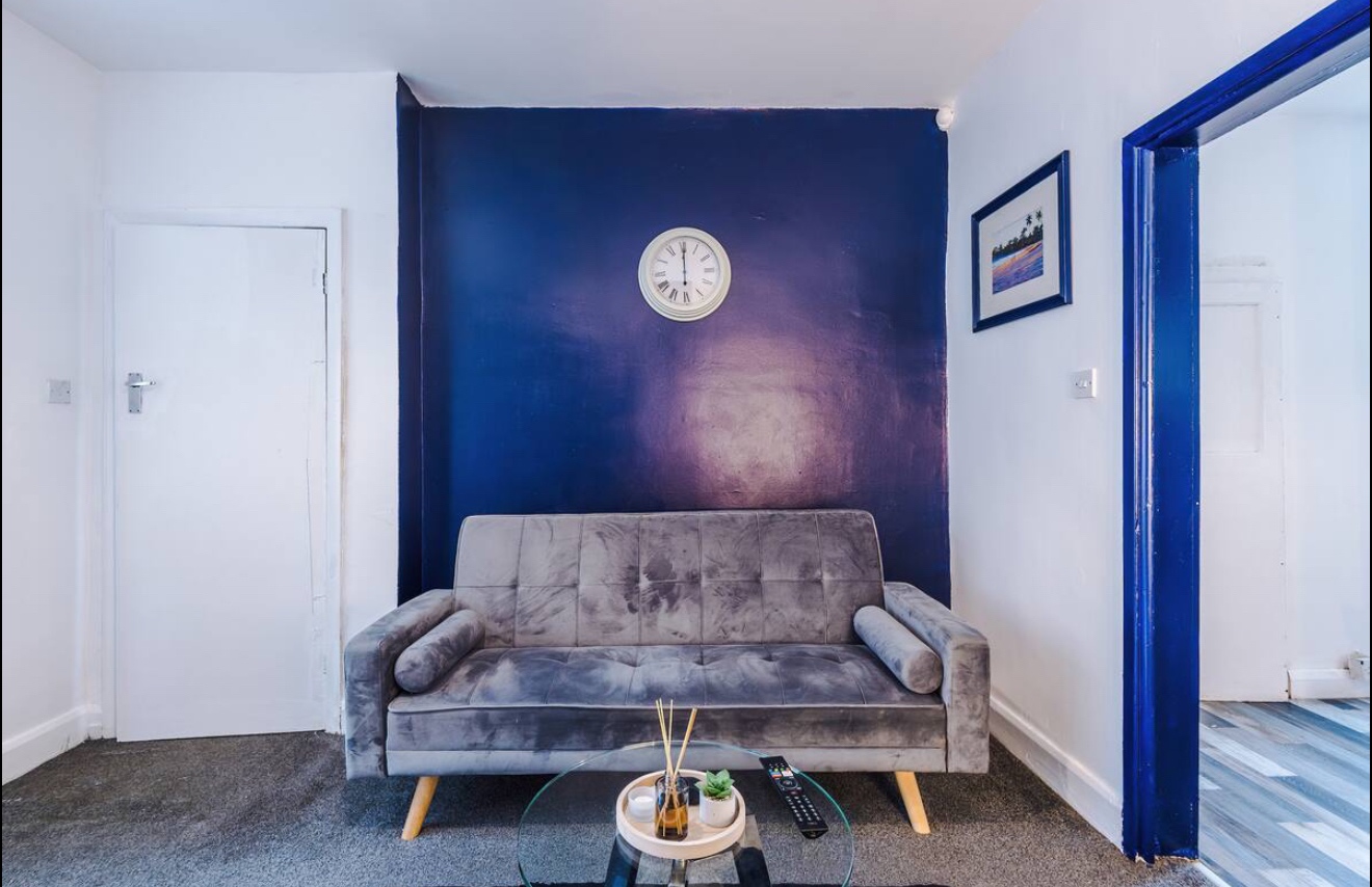 Relax in the tastefully decorated living room featuring a cosy sofa bed and a 43-inch smart TV with free Netflix access. Enjoy the soothing blue accents that bring a touch of elegance to your downtime.