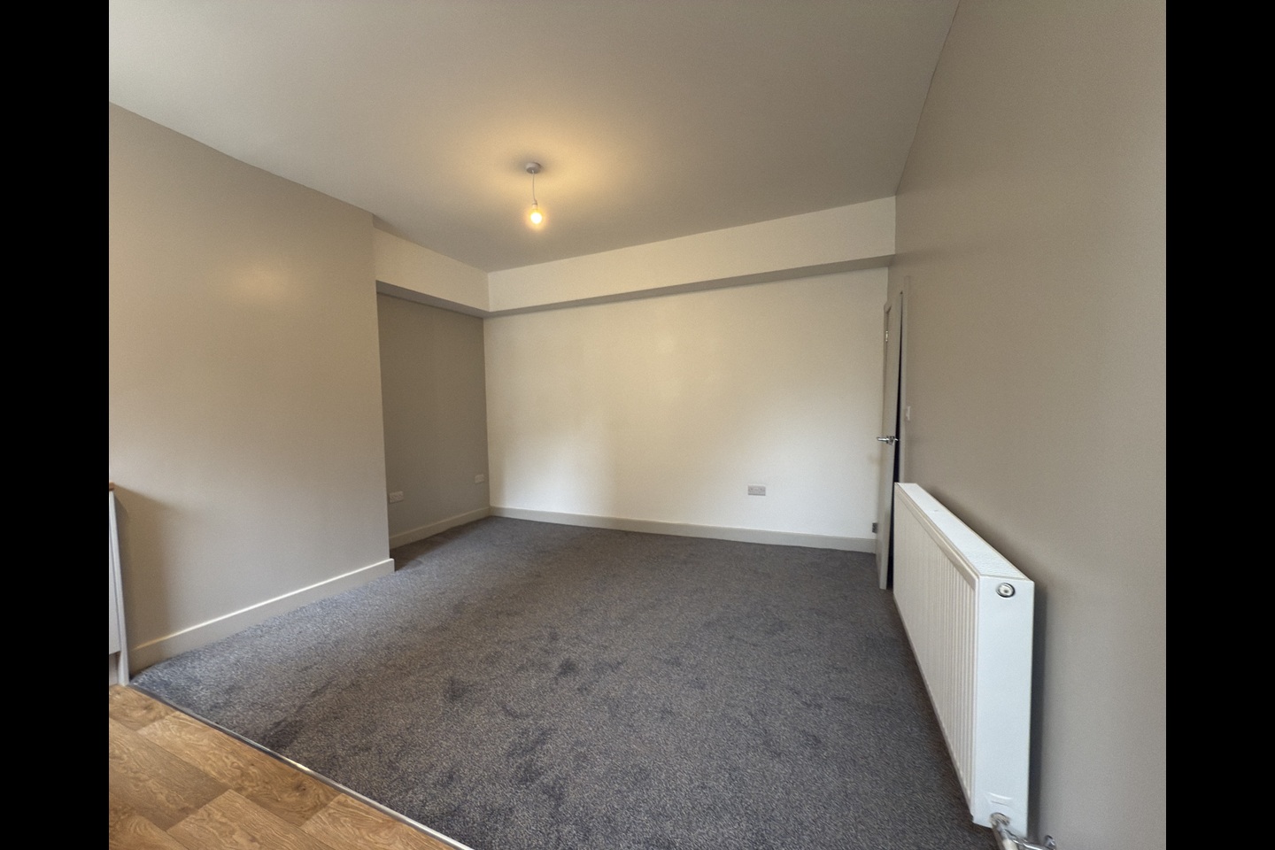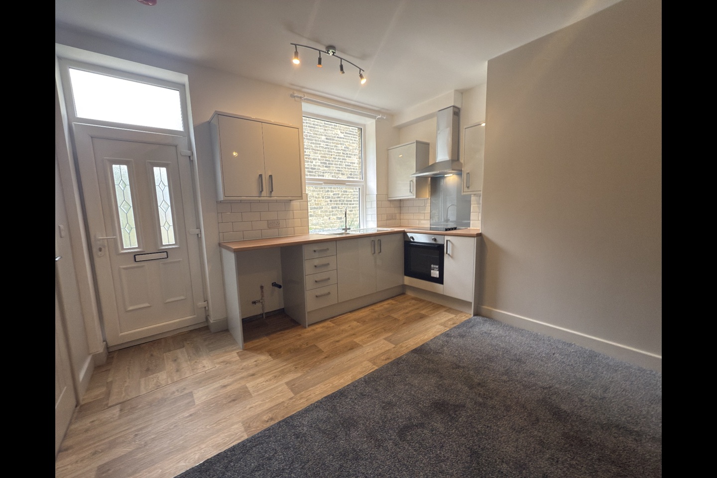 - Open Plan Living Room Kitchen – A modern dove grey fitted kitchen stylish kitchen area with plenty of worktop and storage space, with plumbing for washing machine, transitioning into a carpeted living area.
