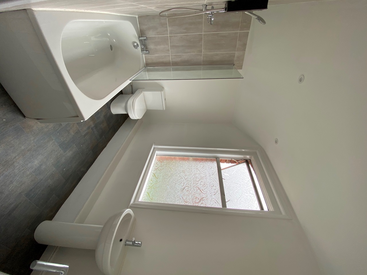 BathroomModern three-piece suite with electric shower over bath.