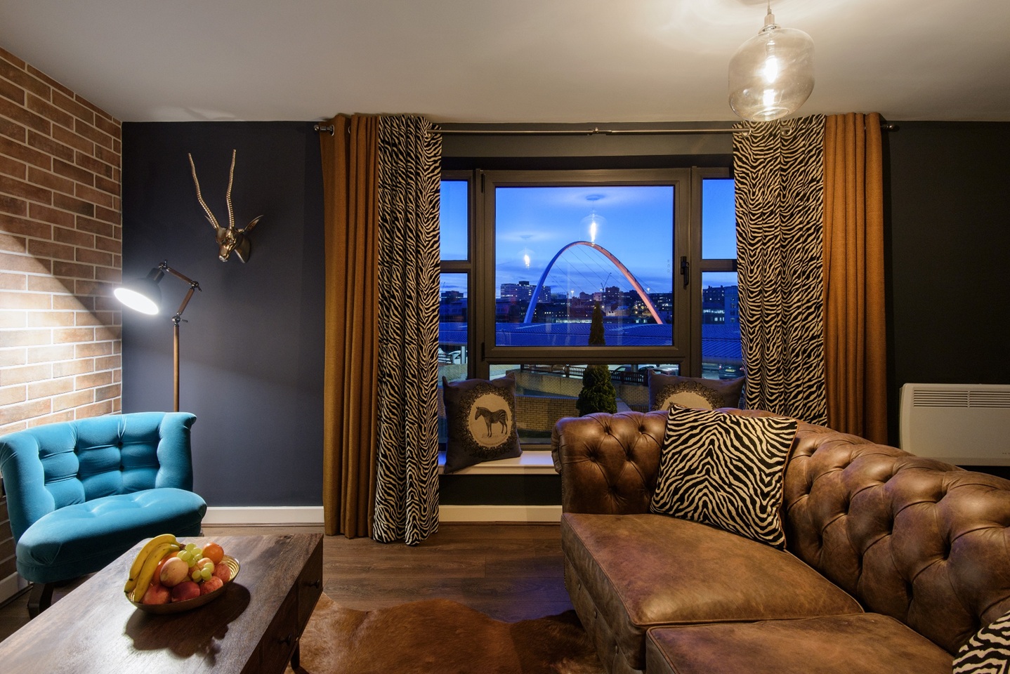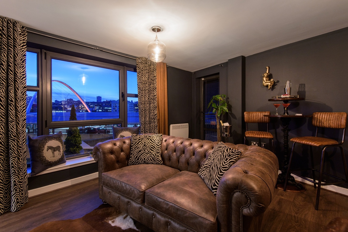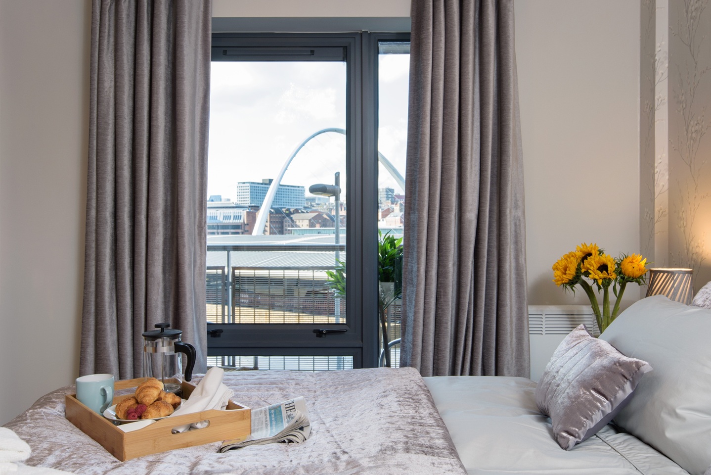 The modern furnished apartment comprises entrance hall leading to the spacious lounge with furnishings including a leather sofa and dining table with 6 chairs. This room offers fabulous views of the River Tyne and bridges and access to a balcony with the same view. The kitchen is situated just off the hall, which is smartly fitted with wooden units, washing machine, dishwasher, oven/hob/extractor and benefits from a freestanding fridge/freezer.
