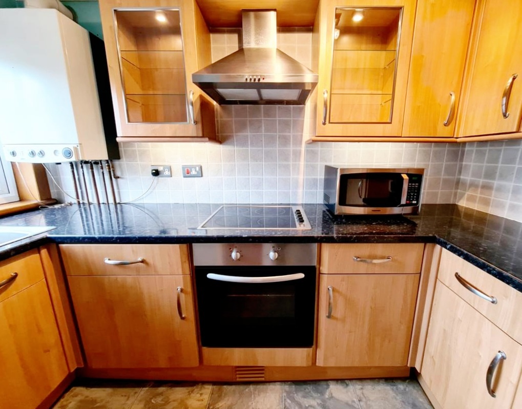- Modern Kitchen fitted with an integrated oven, washing machine, tumble dryer, kettle and microwave.