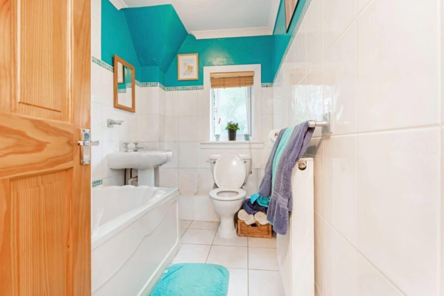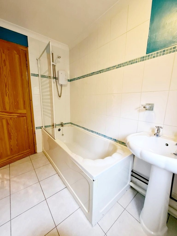 - Bathroom with a contemporary three-piece white suite and panelled bath with overhead shower.