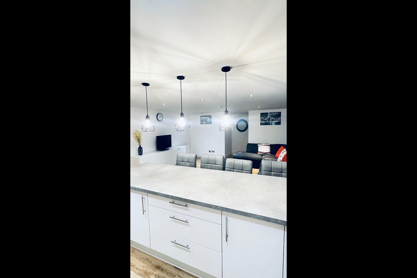 Contemporary Kitchen: Equipped with a substantial breakfast bar and integrated appliances, including a dishwasher, oven, and hob.