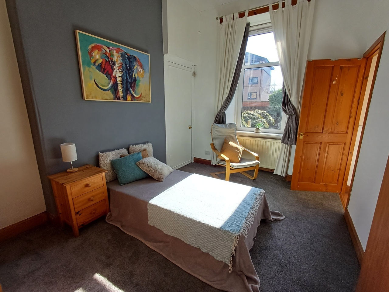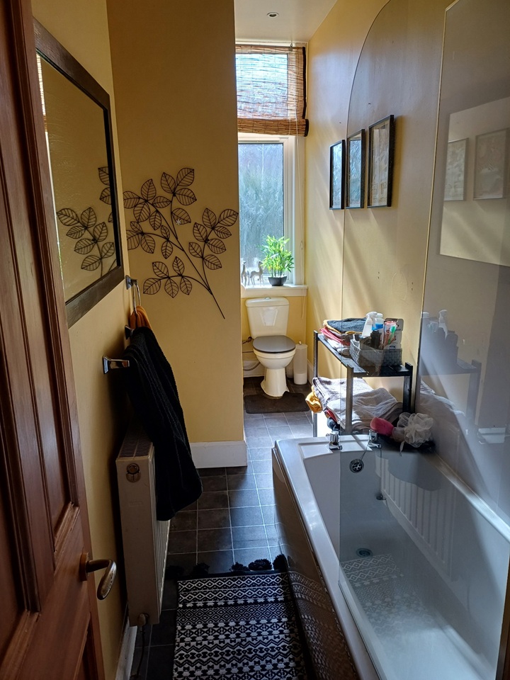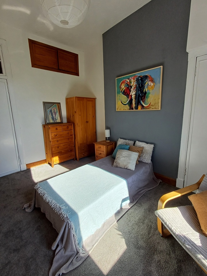 The available bedroom is south facing towards the rear of the tenement and looks onto the large communal back garden. The room has 2 single wardrobes and tall set of drawers and lounge chair. The photos show a single bed, however this has been changed to a double bed.
