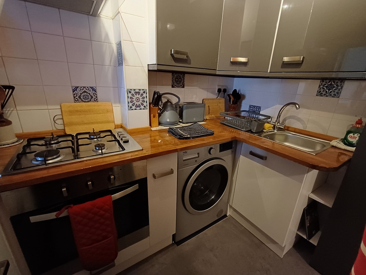 A kitchen which is small but fully functional with washer/dryer, gas hob, electric oven, kettle, toaster, microwave, airfryer and fridge freezer.
