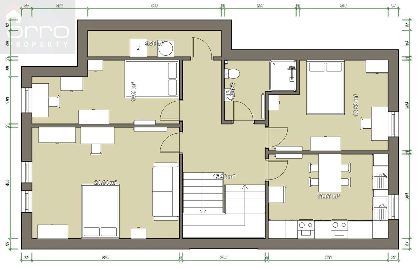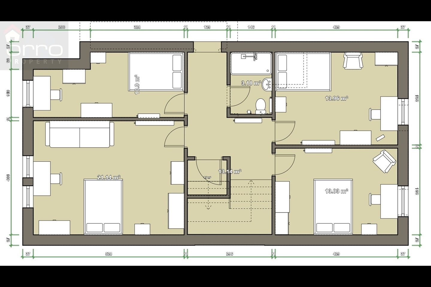 3D projection floorplan - all walls and furnishing items to exact scale.