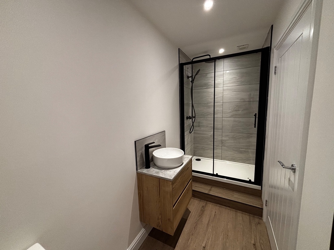 Modern Shower Room: The bathroom consists of a full three-piece suite, including a large walk-in shower, toilet, and washbasin.