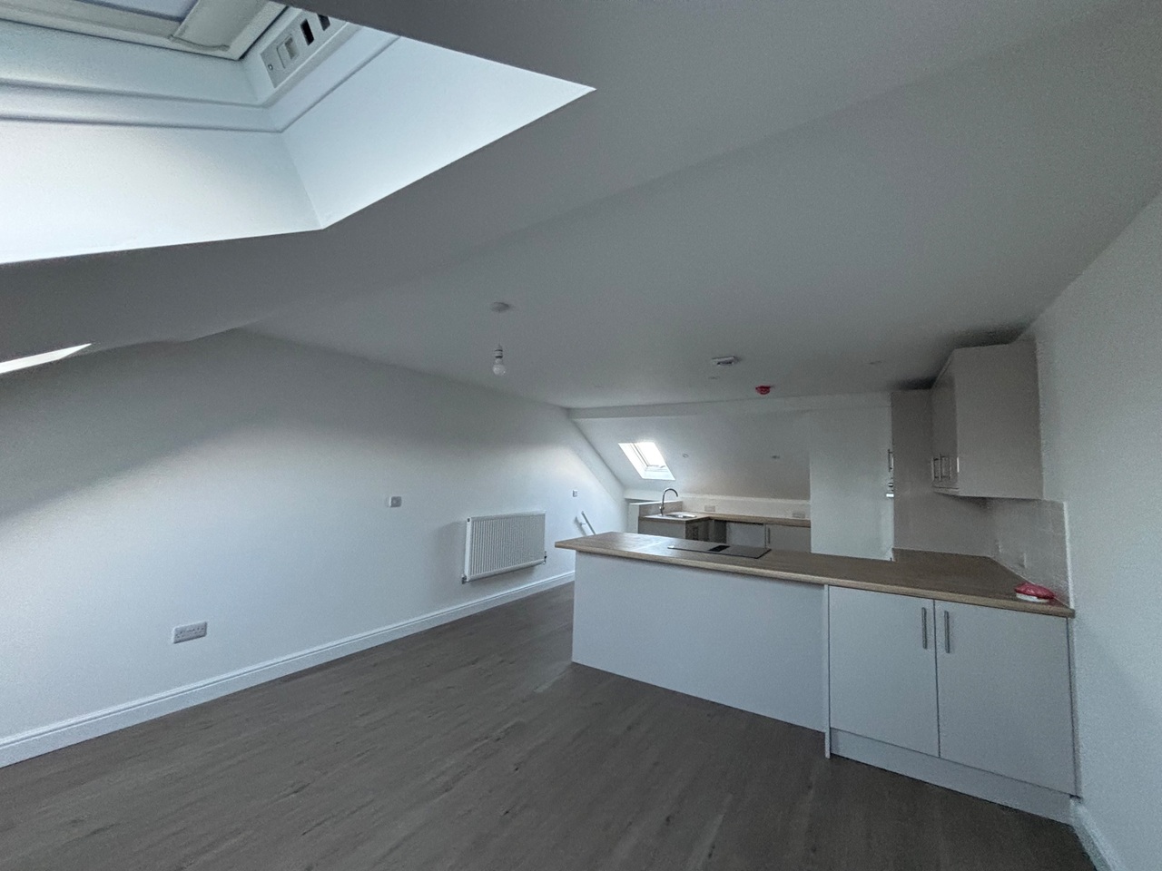 Top-Floor Open-Plan Living: A versatile living, dining, and kitchen area situated on the top floor. This elevated position, combined with high ceilings and multiple Velux windows, ensures a bright and airy environment.