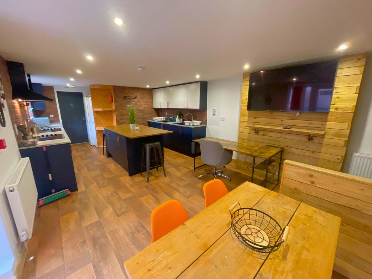 The spacious communal area serves as a welcoming space for collaboration and relaxation, complemented by a well-appointed kitchen that includes all necessary appliances. Adjacent to the kitchen is an open living area, furnished with ample seating and a brand new television, ensuring a comfortable environment for leisure and socializing. Additionally, a convenient pantry room is available next to the kitchen, providing a designated space for laundry.