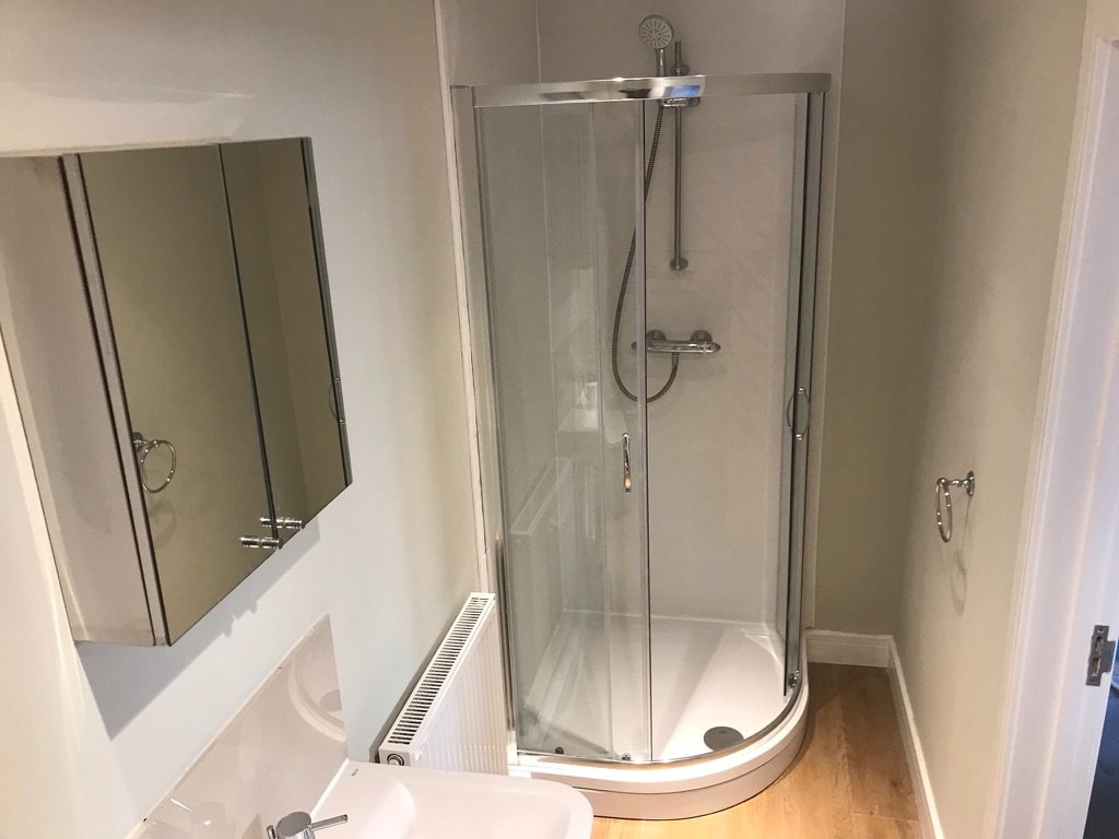En-Suite Shower Room: Features Raco toilet with soft close seat, sink, mirrored medicine cupboard plus shower cubicle, 1 x double radiator., extractor.